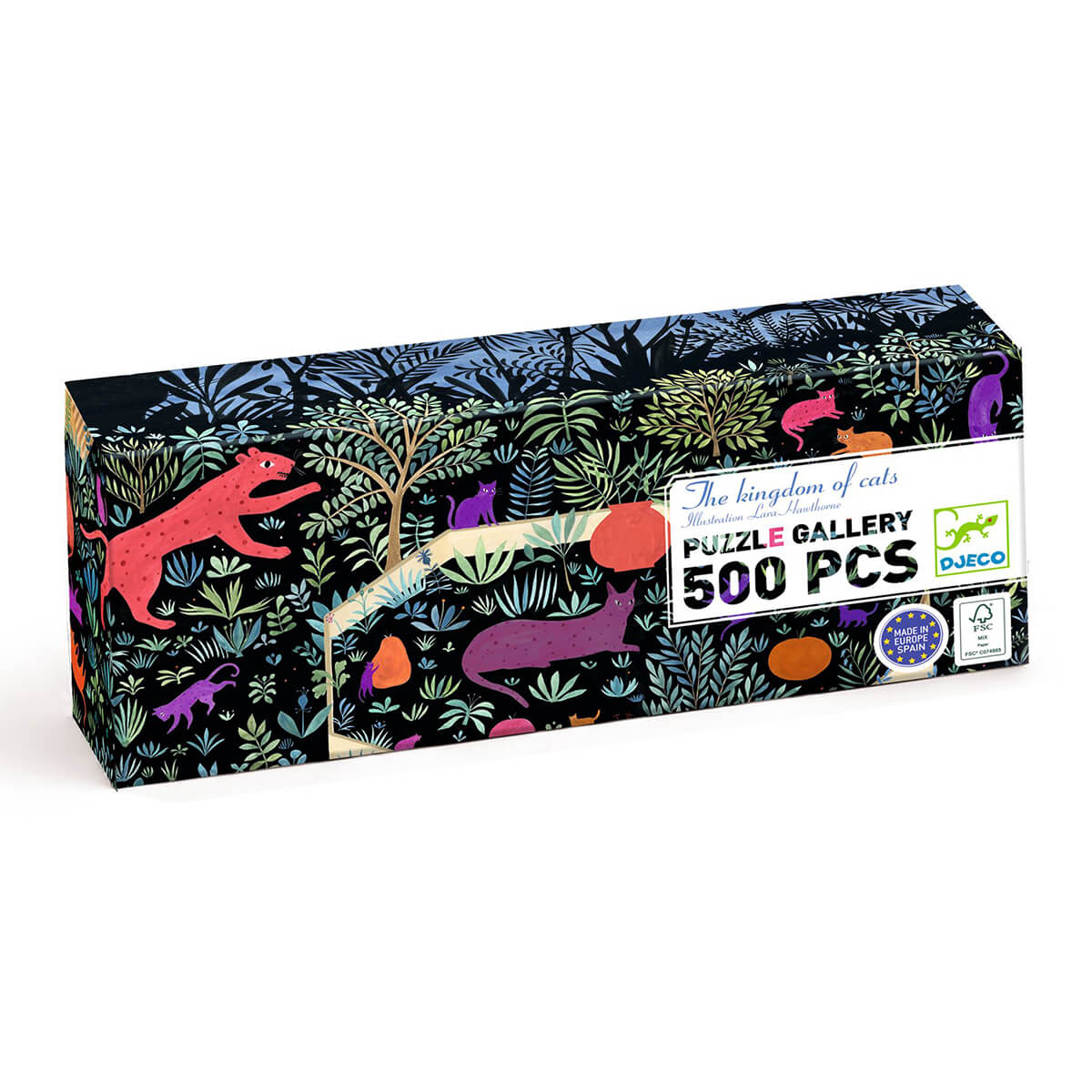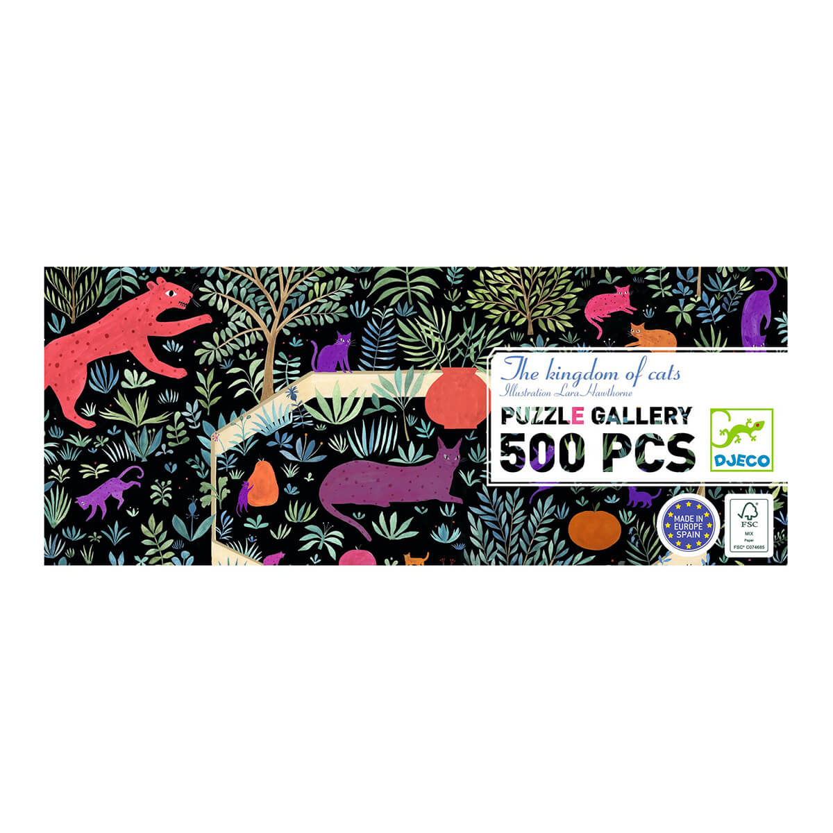 The Kingdom Of Cats 500 Piece Puzzle by Djeco. The Kingdom of Cats is a 500-piece gallery puzzle featuring a world where cats have taken over. Illustrators were given free rein with this novel extra-long puzzle format! A fun and original way for children to discover paintings.