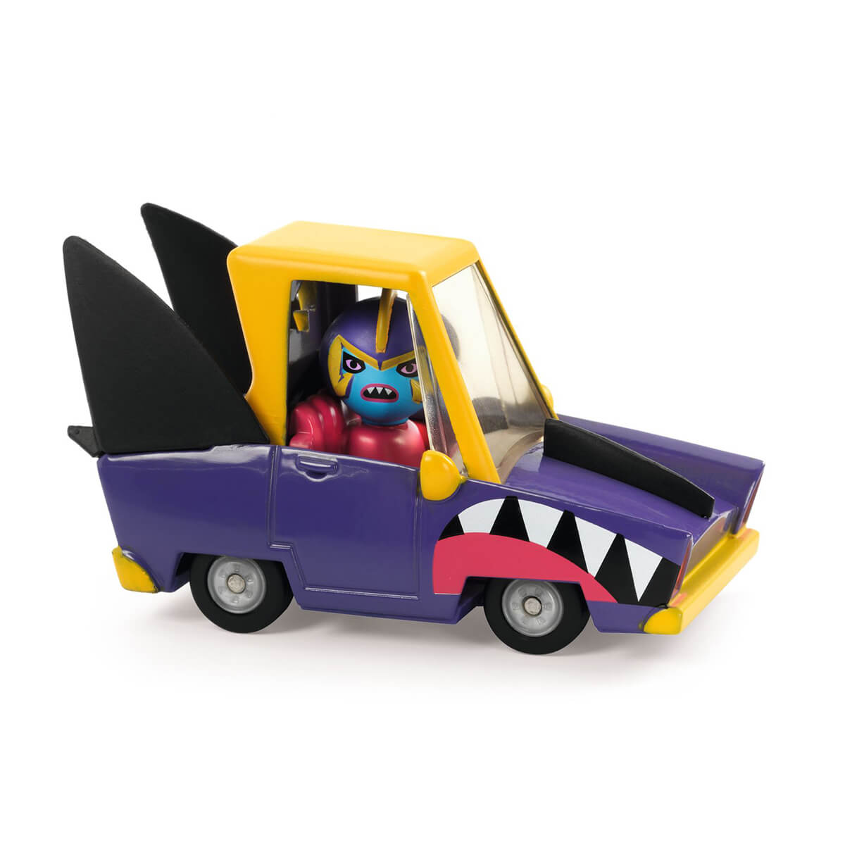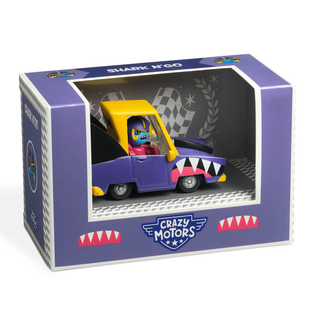 Crazy Motors Shark N'Go Toy Car by Djeco. Shark N'Go and its shark driver aren't making any friends in the city. Shark is a car that lives up to its name, with its ferocious teeth, and it's best not to cross it.