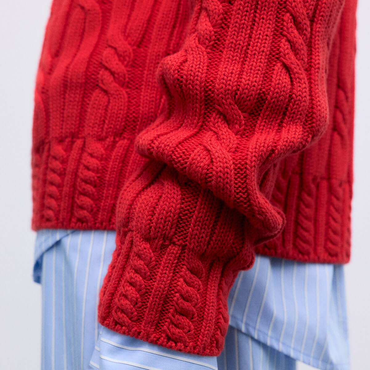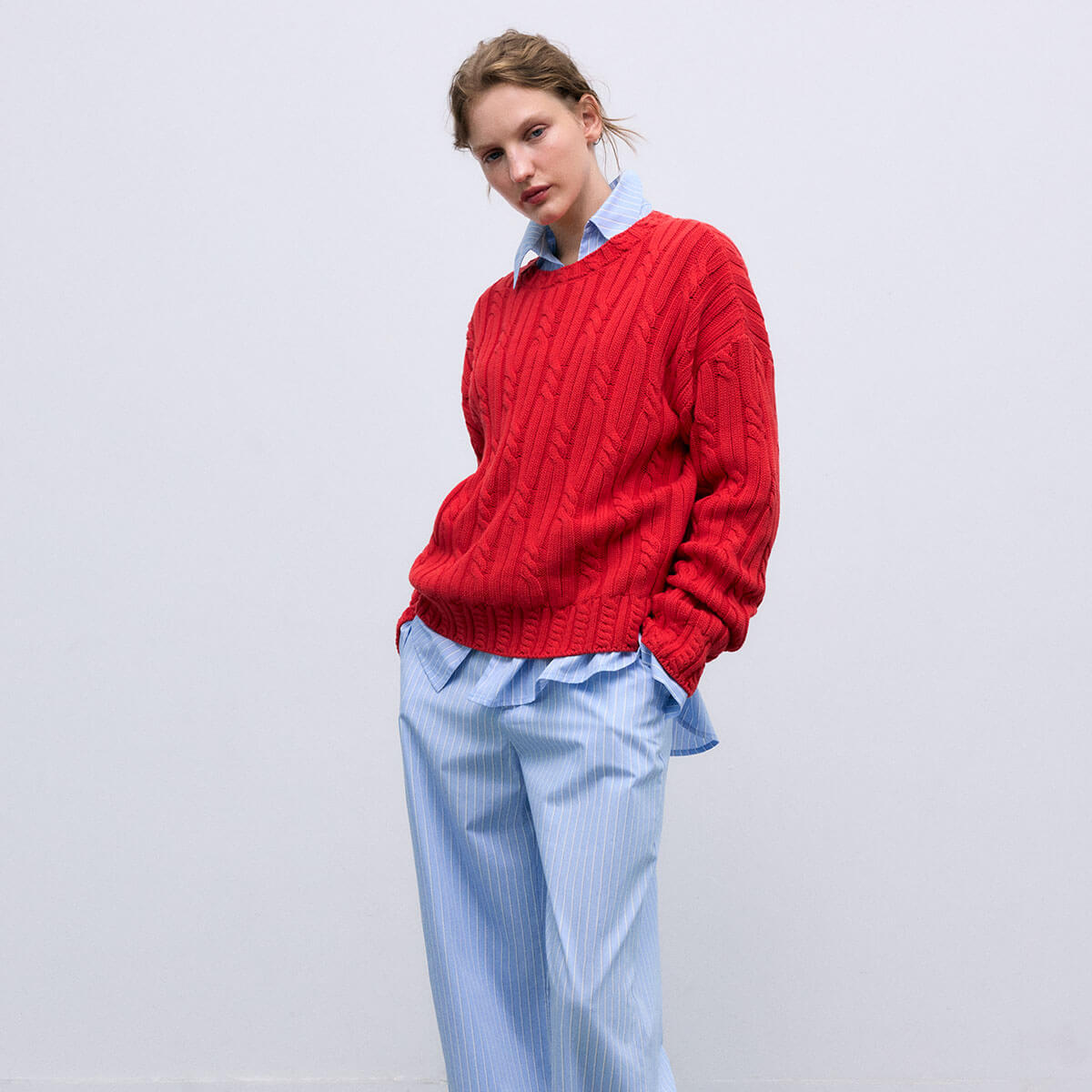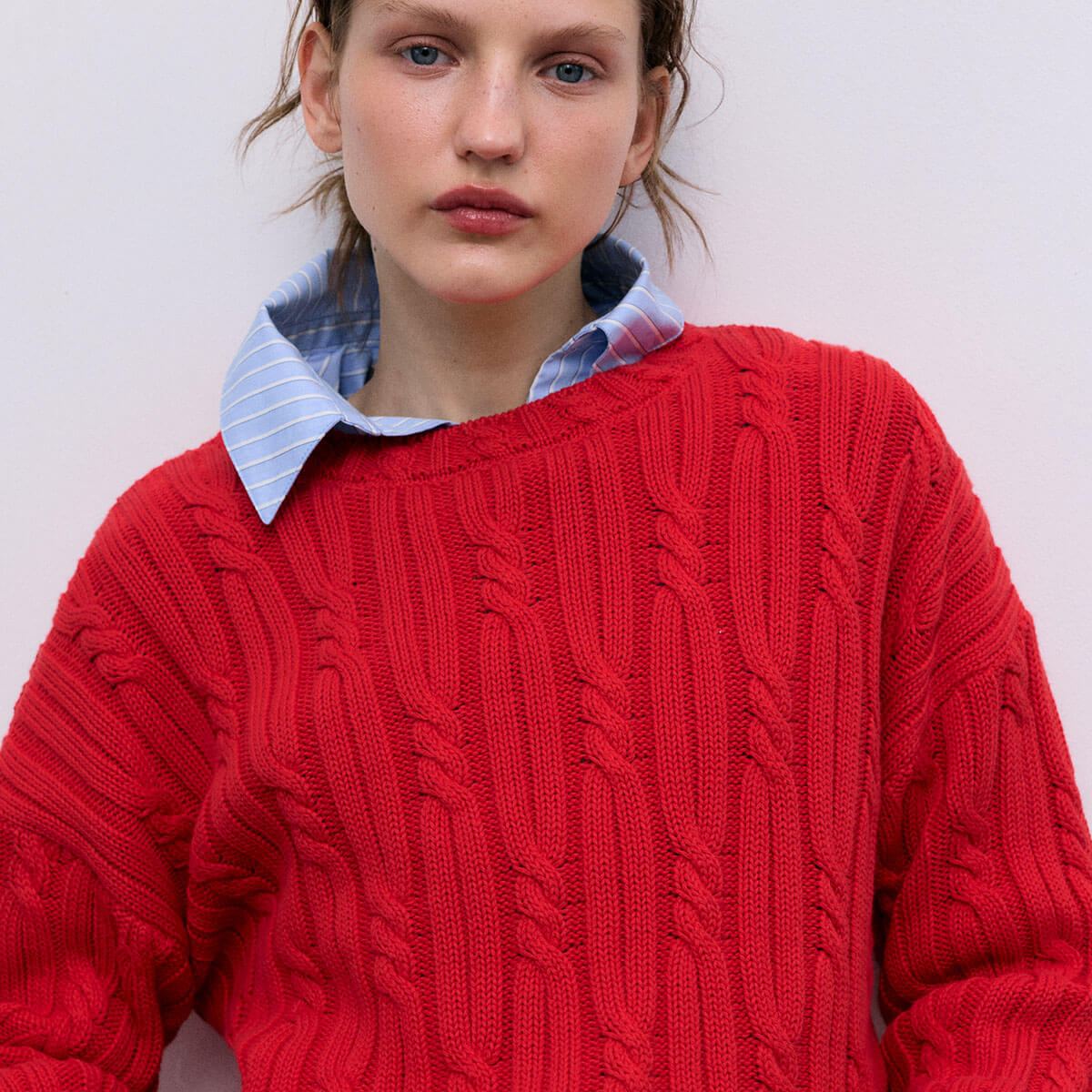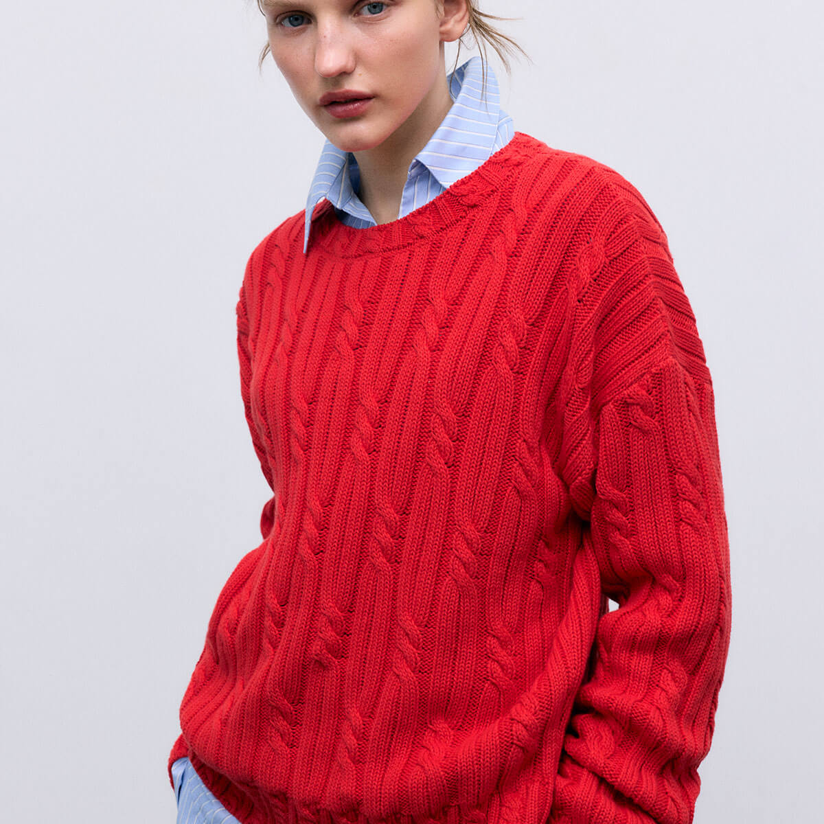 Bluebell Jumper by The New Society Womenswear. Cable-knit sweater with small cable-knit details on the collar, cuffs, and hem, in a beautiful tulip red tone.