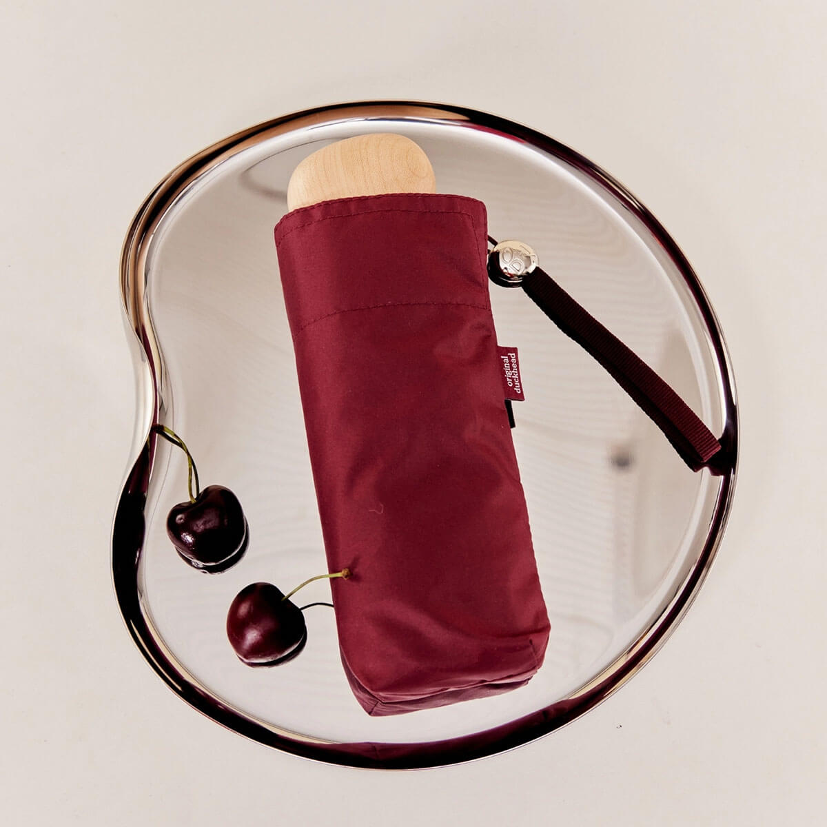 Cherry Mini Pocket Umbrella by Original Duckhead. Meet The Mini – Original Duckhead’s most compact umbrella yet, a fashion-forward everyday essential. Designed in London and handmade with care, The Mini combines style, sustainability, and portability in one. With its smooth pebble-shaped maple wood handle and sleek silver accents, it’s as much a fashion accessory as it is a practical umbrella. Compact enough to slip into a handbag, clutch, pocket, or backpack. The Mini is perfect for city living, commuting, or travel – always ready when the weather turns.