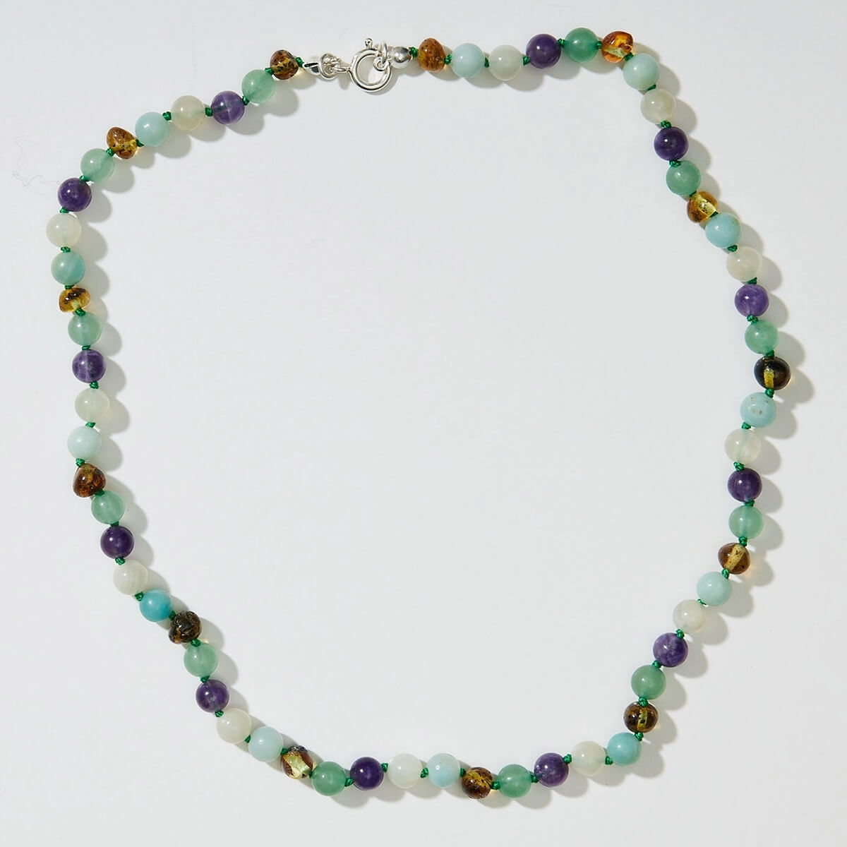 Fenja adult necklace in green amber and amethyst by Nirrimis. Pretty handmade necklace featuring ethically sourced polished Baltic amber and semi-precious stones including green amber, amethyst, aventurine, amazonite and moonstone finished with a 925 sterling silver bolt ring clasp. 45cm long in length to fall just below the collarbone and a perfect length for everyday wear.