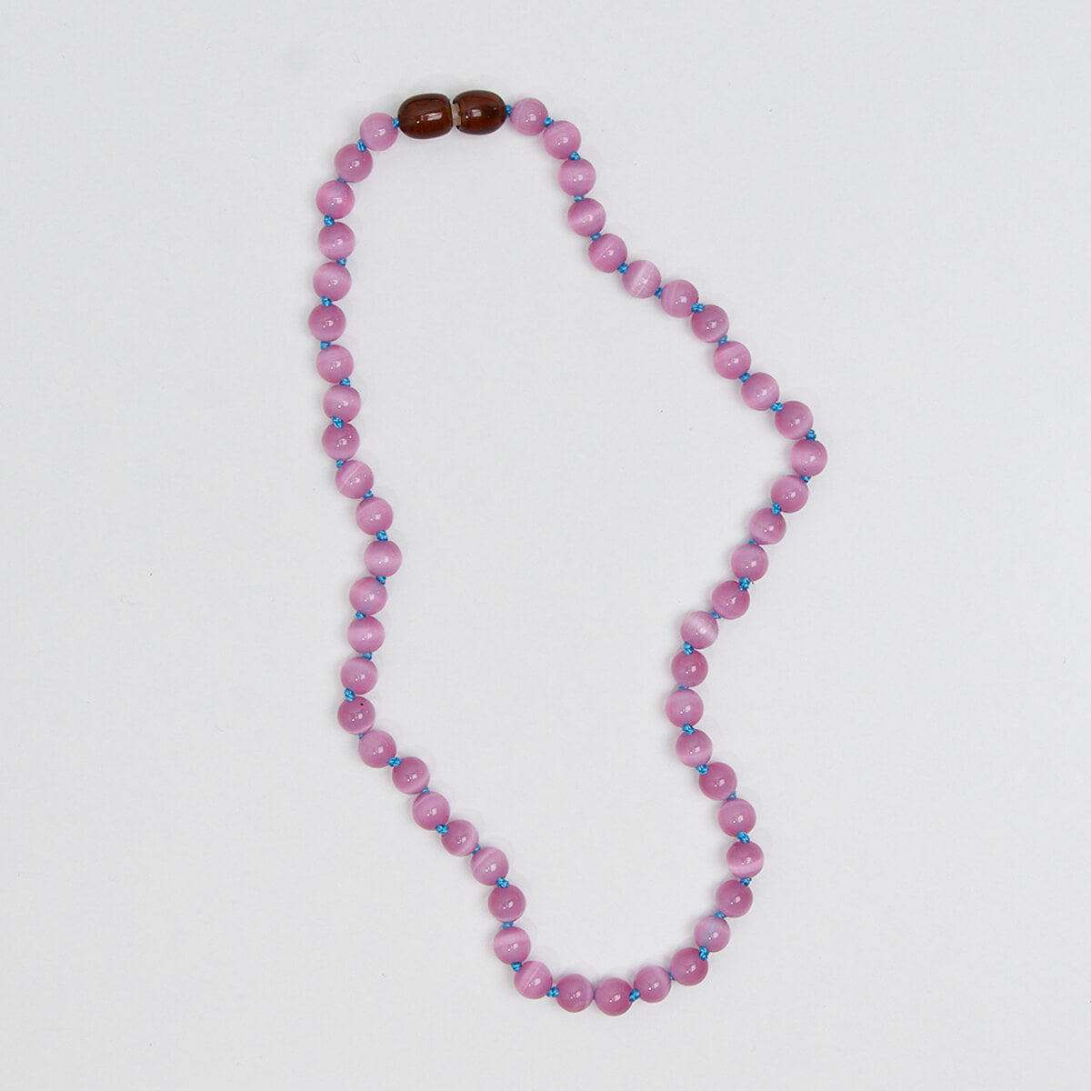 Irma kids necklace in pink cat's eye by Nirrimis. Pretty handmade necklace featuring ethically sourced polished Baltic amber and pink cat's eye semi-precious stones. 38cm long including safety clasp.