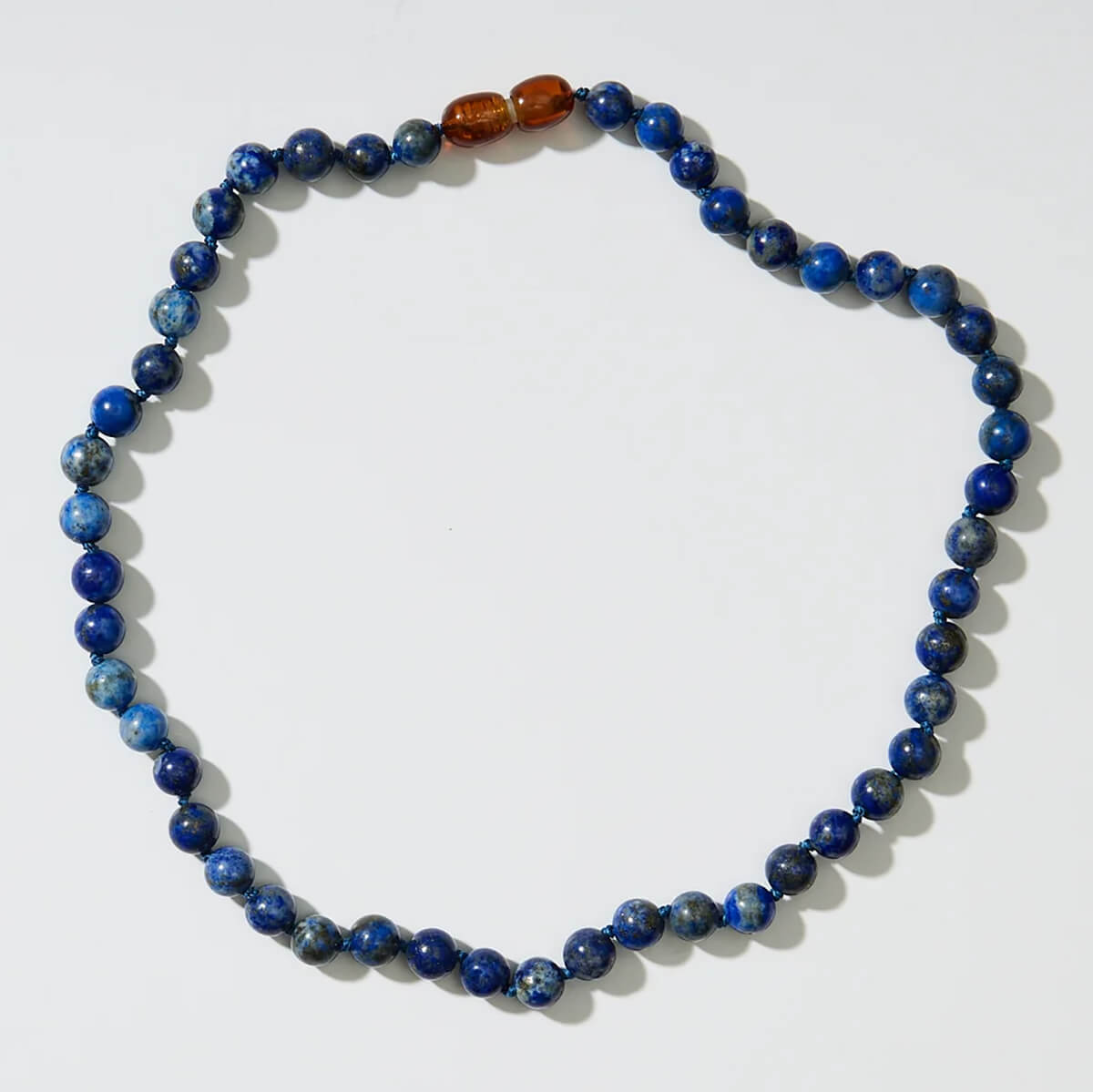 Lapis Lazuli kids necklace by Nirrimis. Pretty handmade necklace featuring ethically sourced polished Baltic amber and lapiz lazuli semi-precious stones. 38cm long including safety clasp.