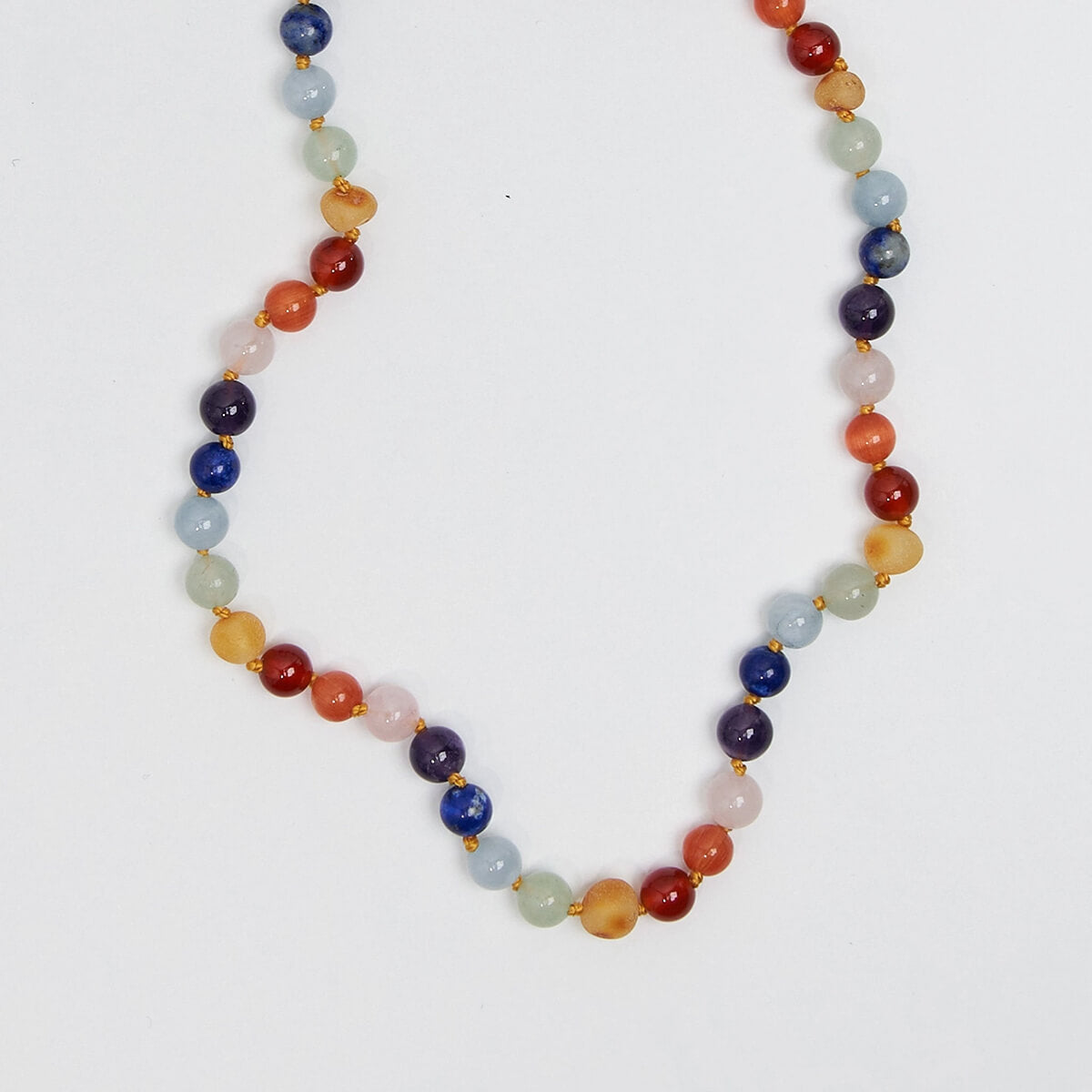 Party adult necklace in rainbow gemstones by Nirrimis. Pretty handmade necklace featuring ethically sourced polished Baltic amber and semi-precious stones including beautiful amethyst, aventurine, sunstone, lapis lazuli, rose quartz, carnelian and aquamarine finished with a 925 sterling silver bolt ring clasp. 45cm long in length to fall just below the collarbone and a perfect length for everyday wear.