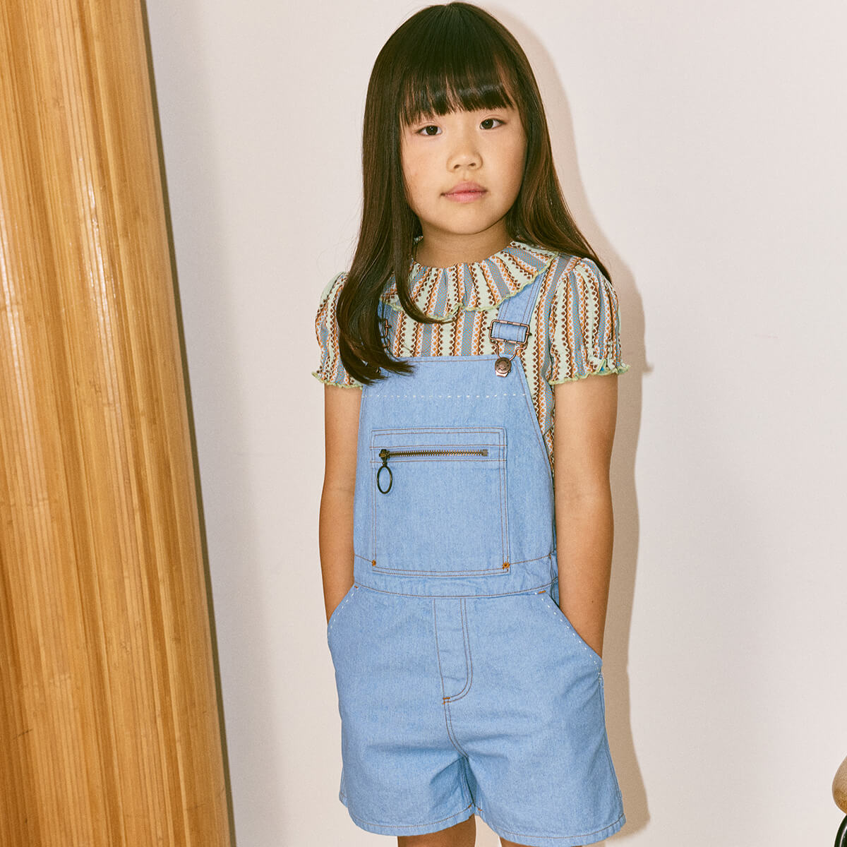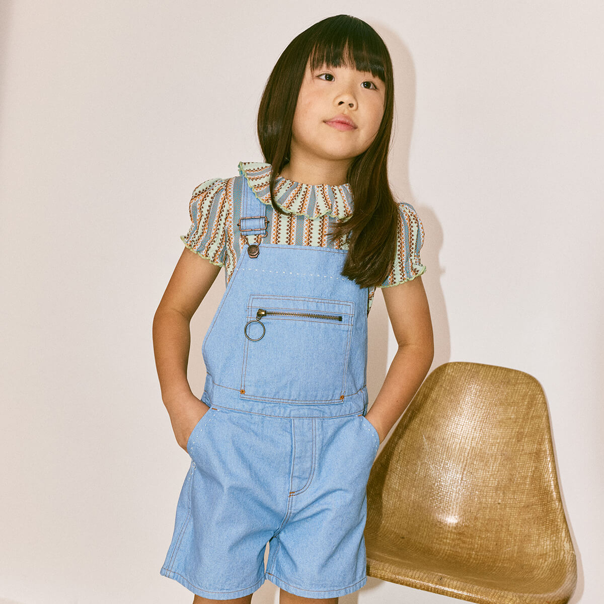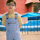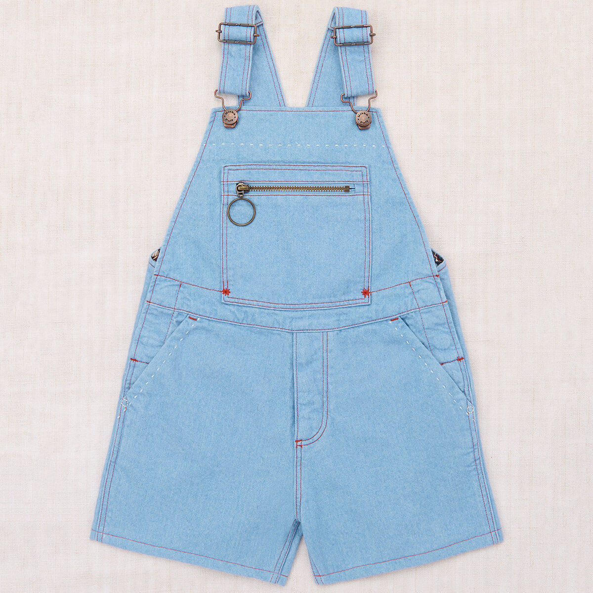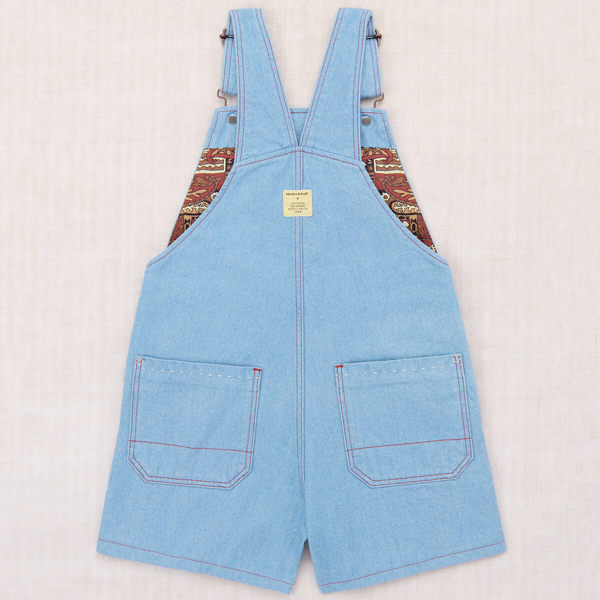 Zip Overall Shorts by Misha & Puff. A vintage-inspired overall short in 100% cotton denim, with adjustable straps, print-lined front-zip bib pocket, two front pockets, two back patch pockets, and all-over contrast topstitch detail. Finished with hand-tacked stitches instead of rivets for softness.