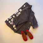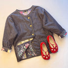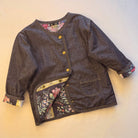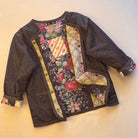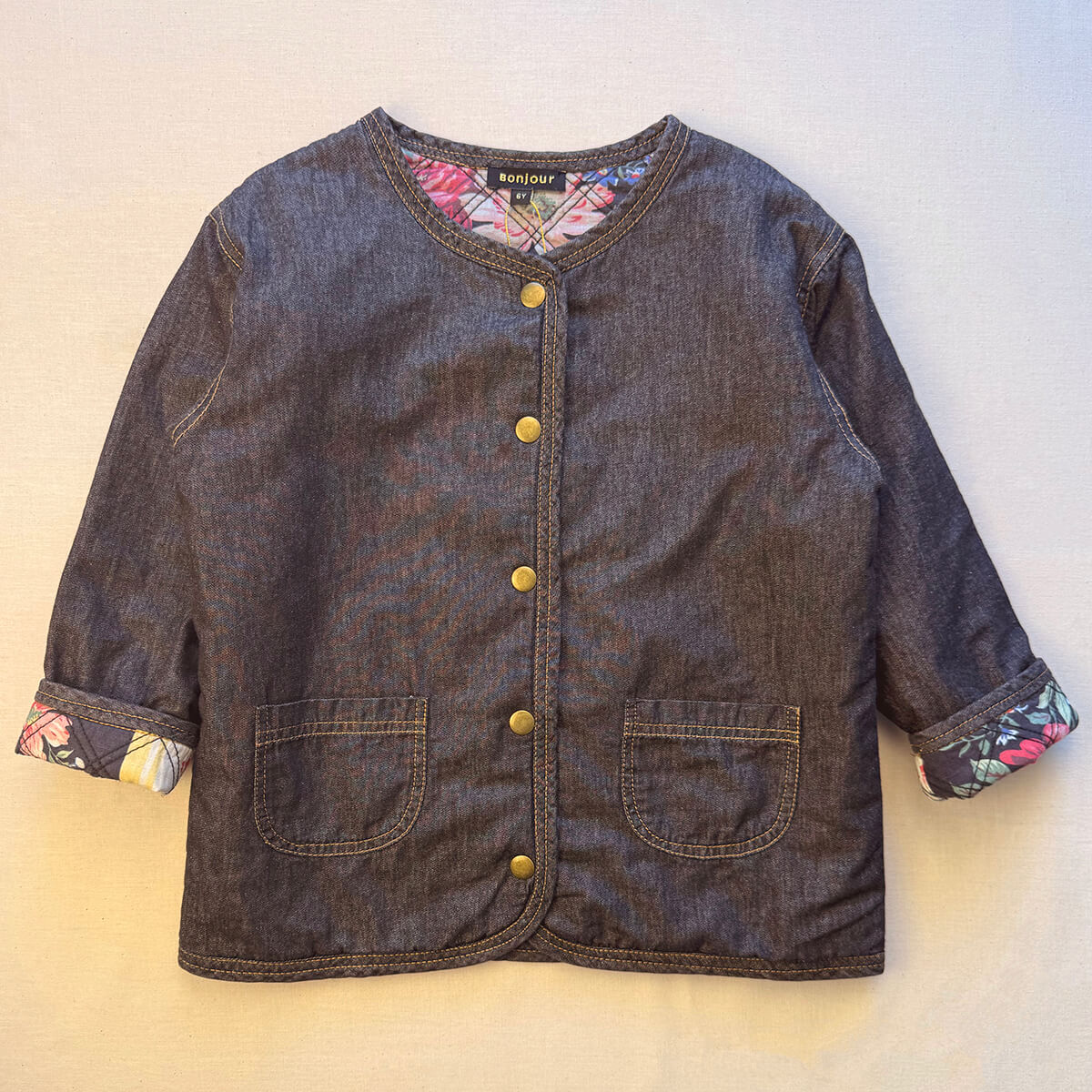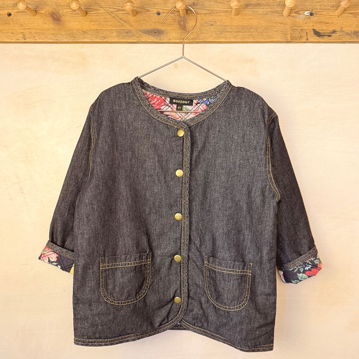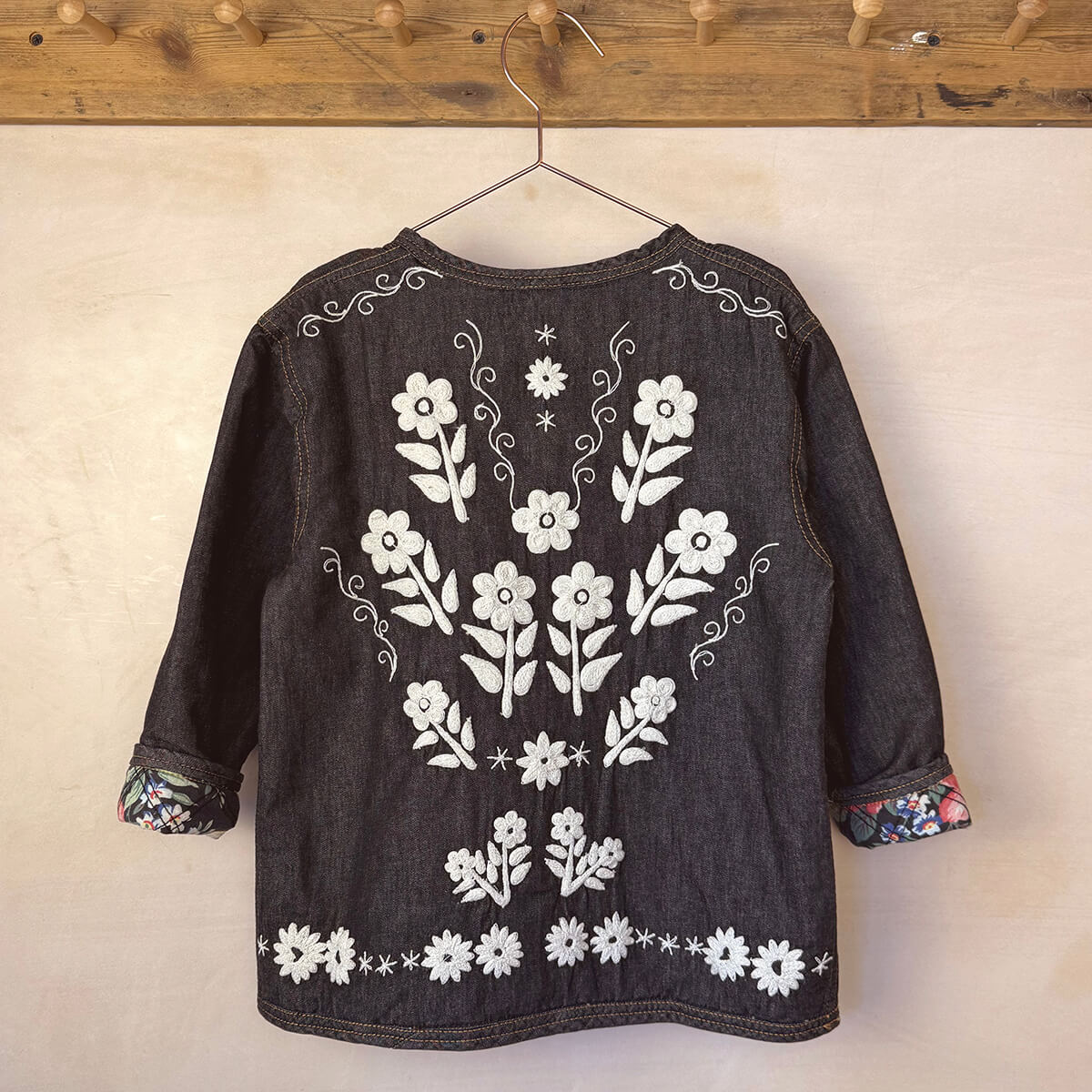 JUNIOR EDITION EXCLUSIVE Denim Jacket by Bonjour. This beautiful denim jacket has ivory embroidery on the back and a black quilted lining in Bonjour's Arles floral print. This is a lightweight drapey denim fabric and hangs beautifully. The perfect transitional jacket.