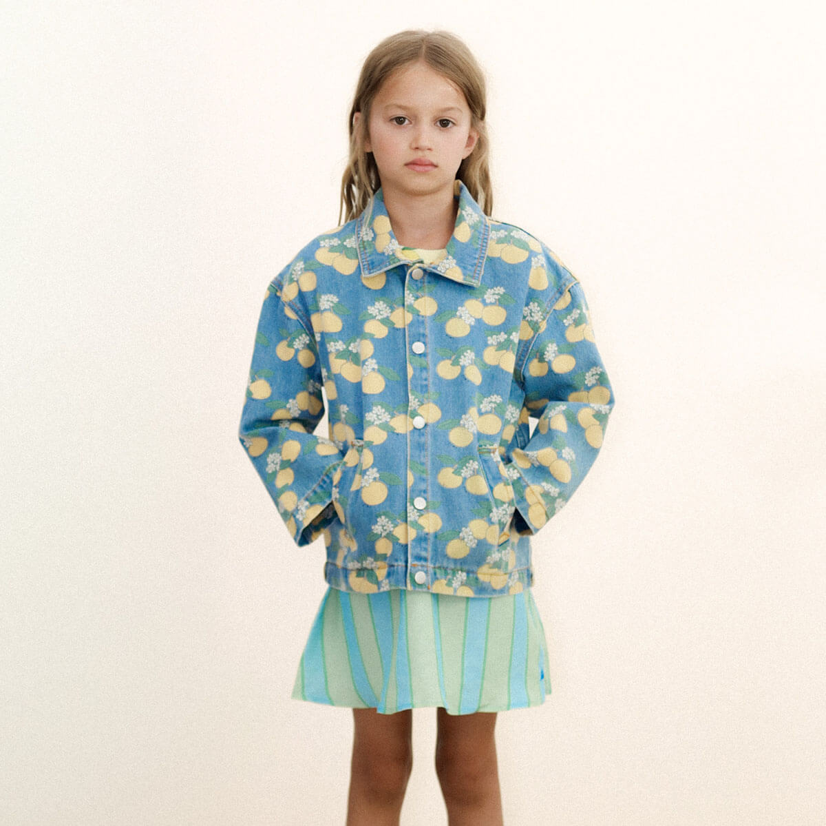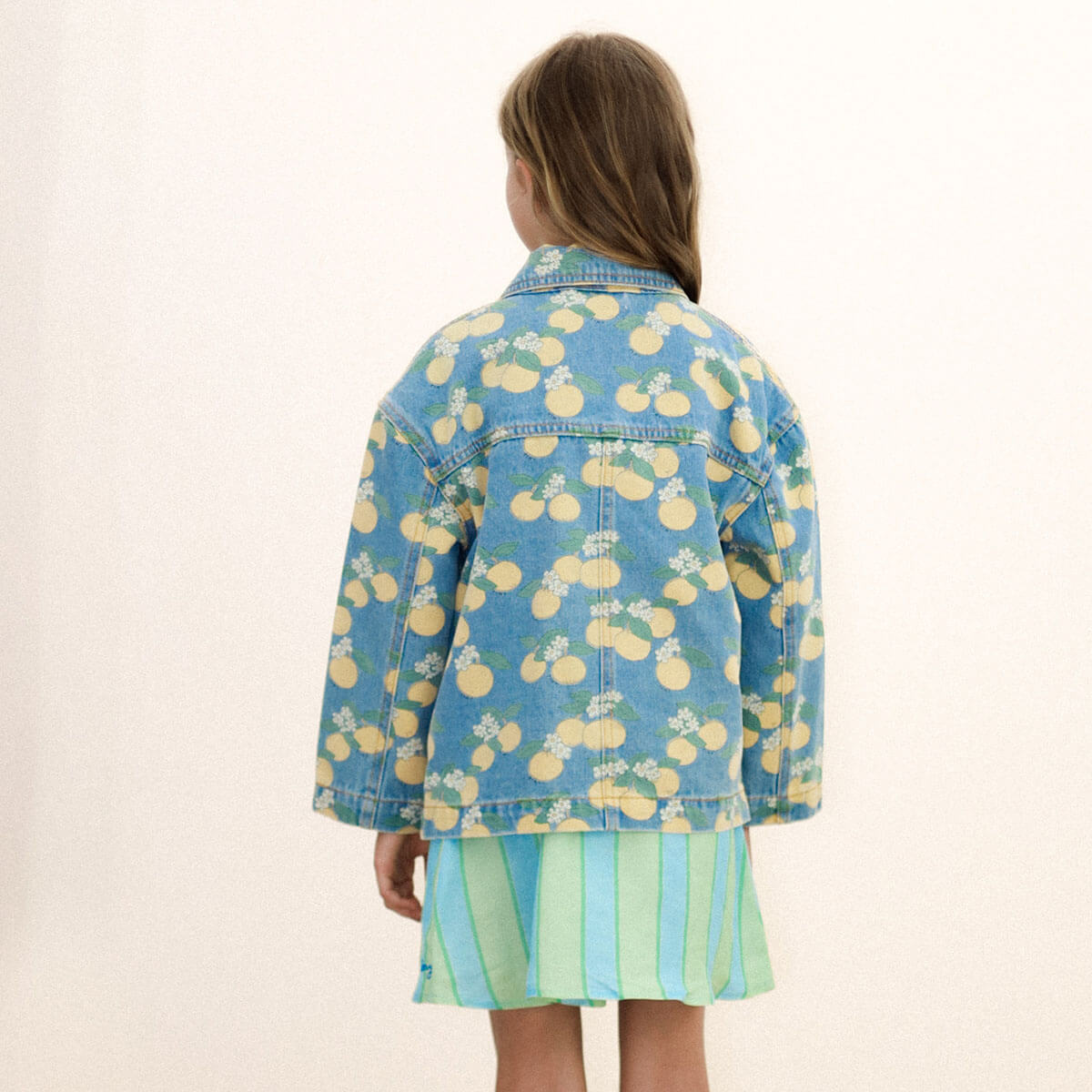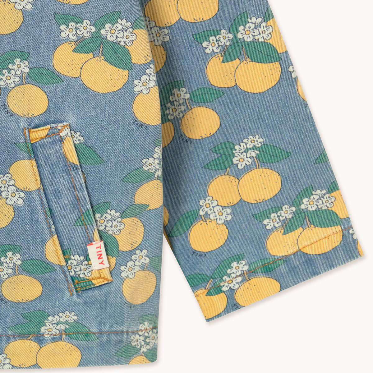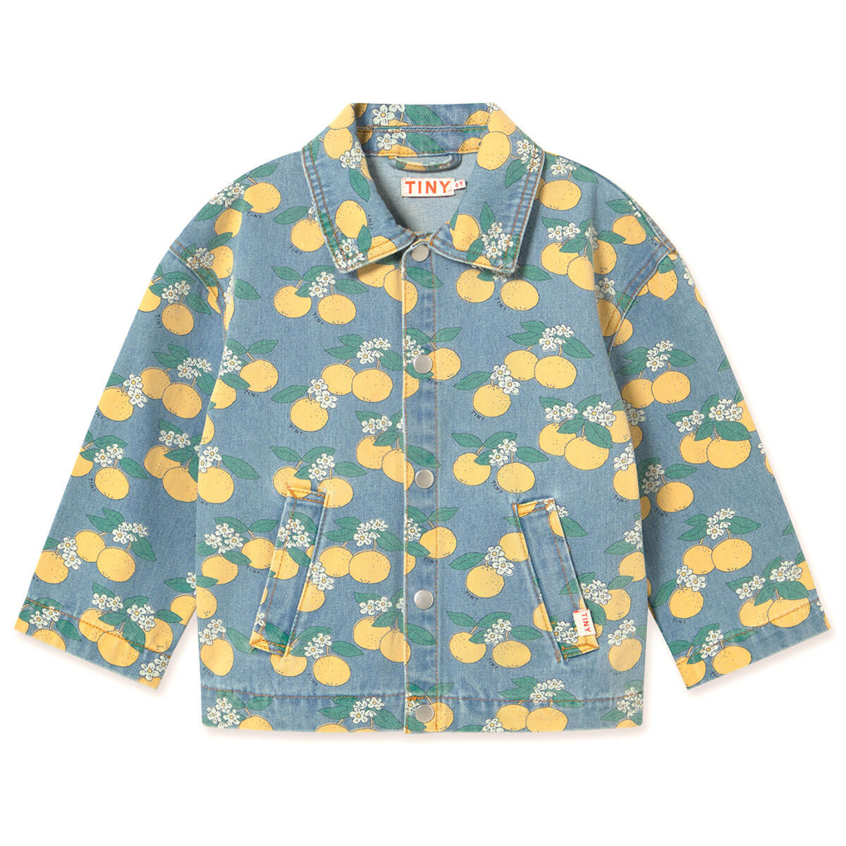 Oranges Jacket by Tinycottons. This denim jacket with an oranges print combines style and freshness in a must-have piece. Featuring a shirt collar, front pockets, and a snap button front, it offers comfort and practicality. Perfect for adding a cheerful touch to any outfit while keeping you stylish throughout the day.