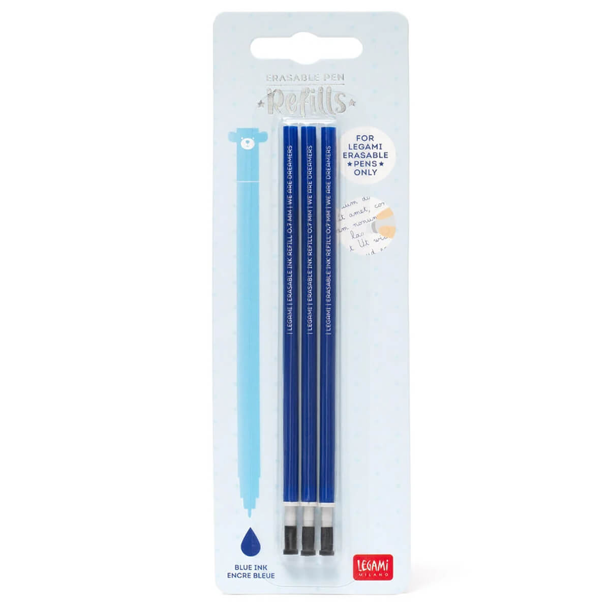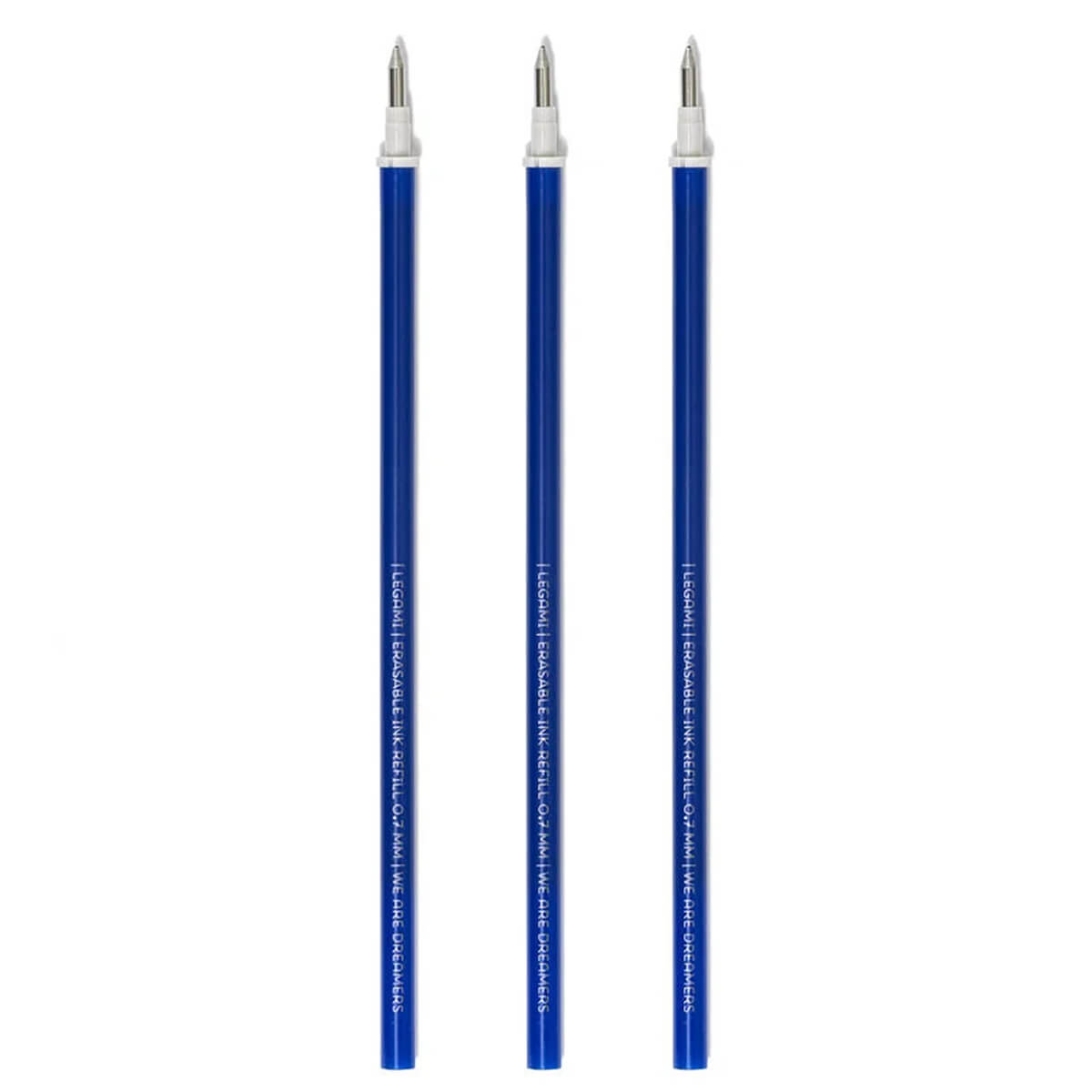 Refill for erasable pen blue 3pcs by Legami.  Run out of ink in your Legami Erasable Gel Pen? We got you. Simply insert this blue ink refill into your Legami Erasable Gel Pen and get back to writing! The refill has a 0.7 mm tip and contains heat-sensitive ink which can be erased with the Erasable Pen's eraser tip.