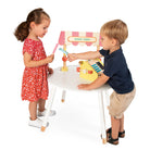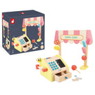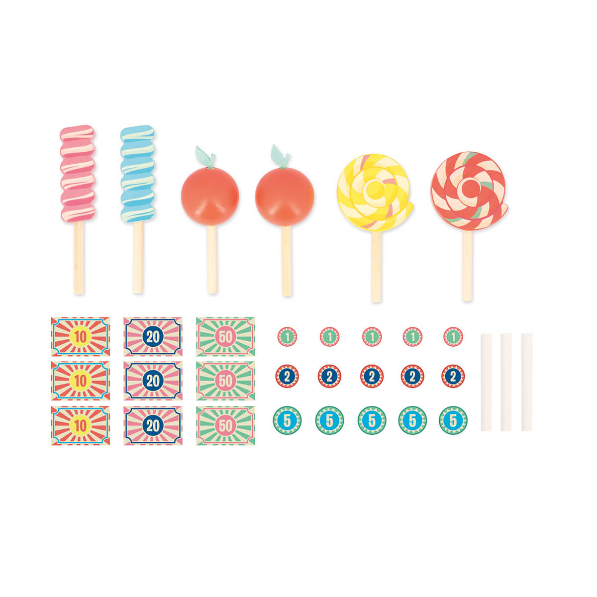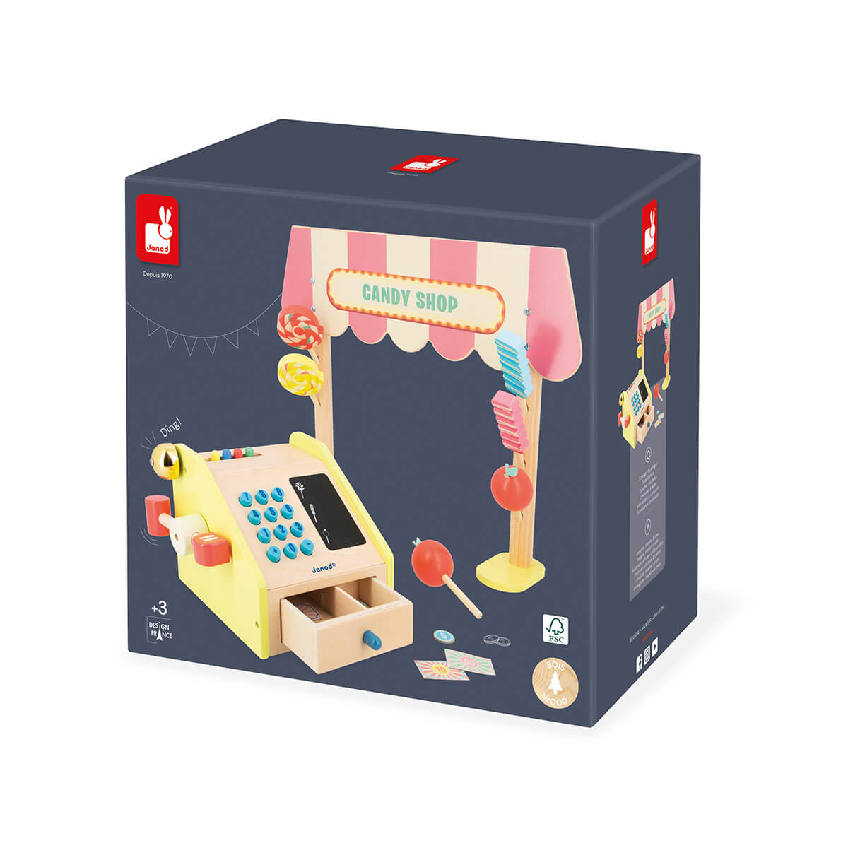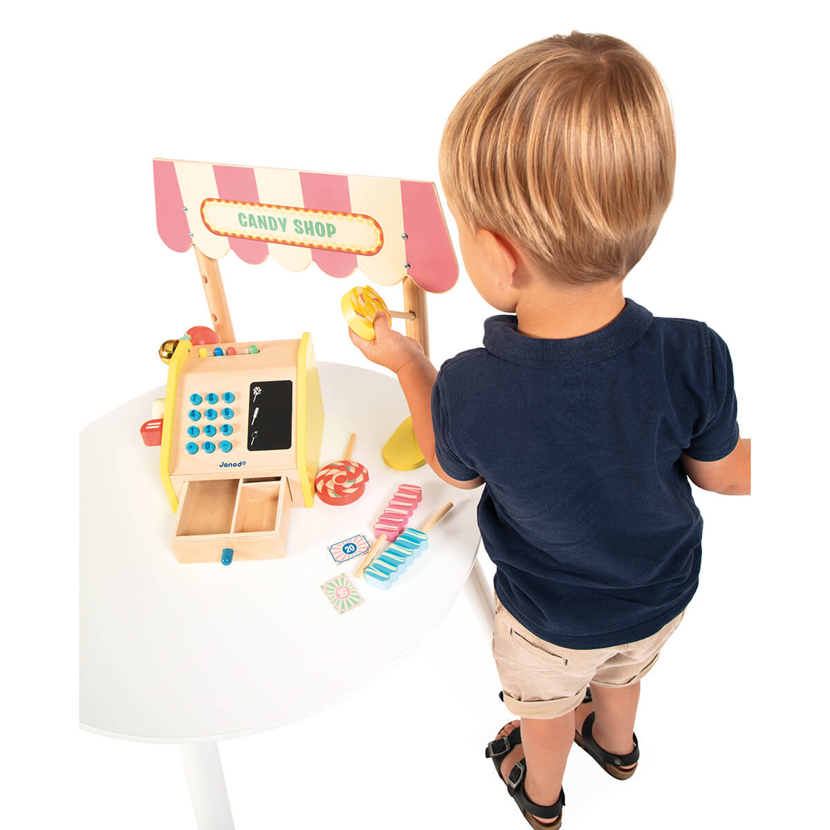 Candy Shop by Janod. This sweet treat wooden pretend play shop contains 1 shop awning, 6 wooden treats (2 round lollipops, 2 rectangular lollipops and 2 candy apples), 1 cash register with a blackboard area to write down the prices, 9 paper banknotes, 15 cardboard coins and 2 pieces of chalk. The till buttons are made from ultra soft-touch silicone. Helps children with their maths and sums while having fun.