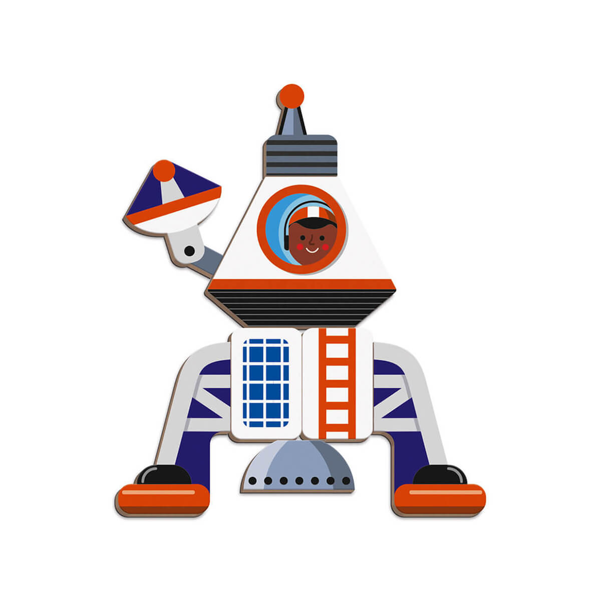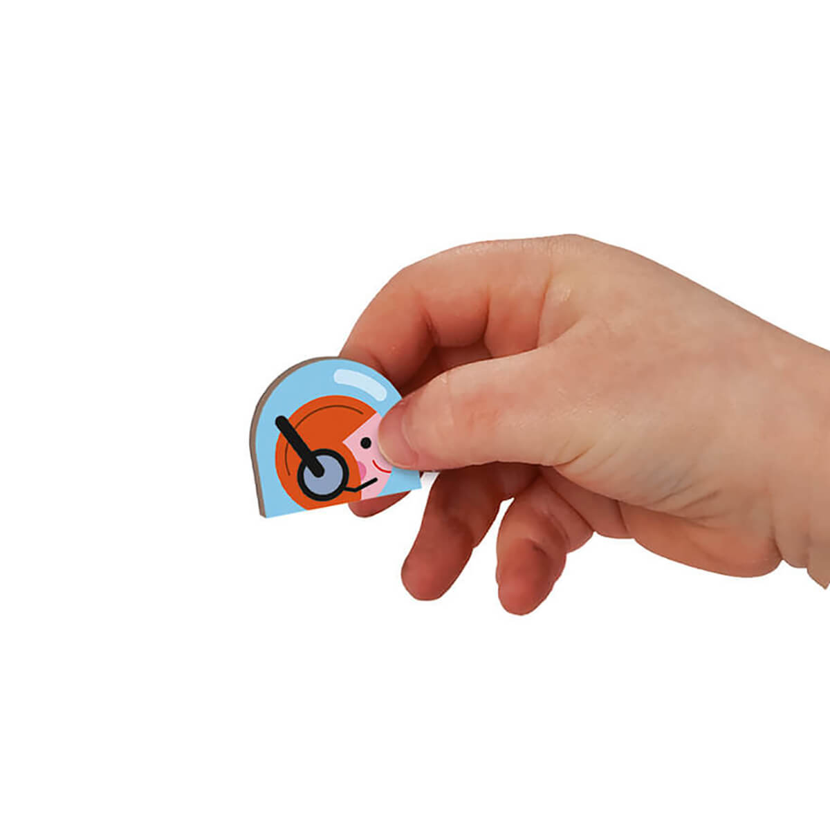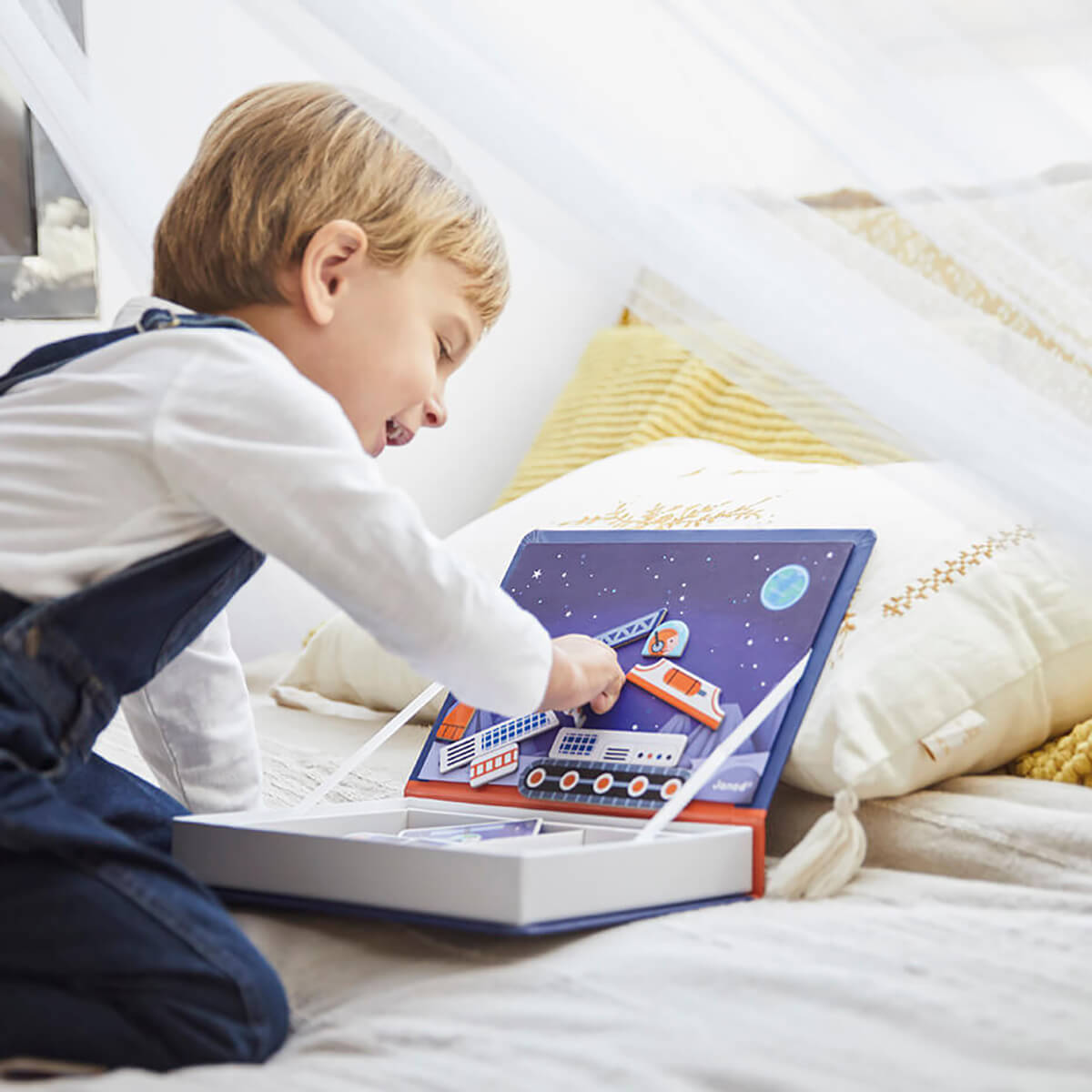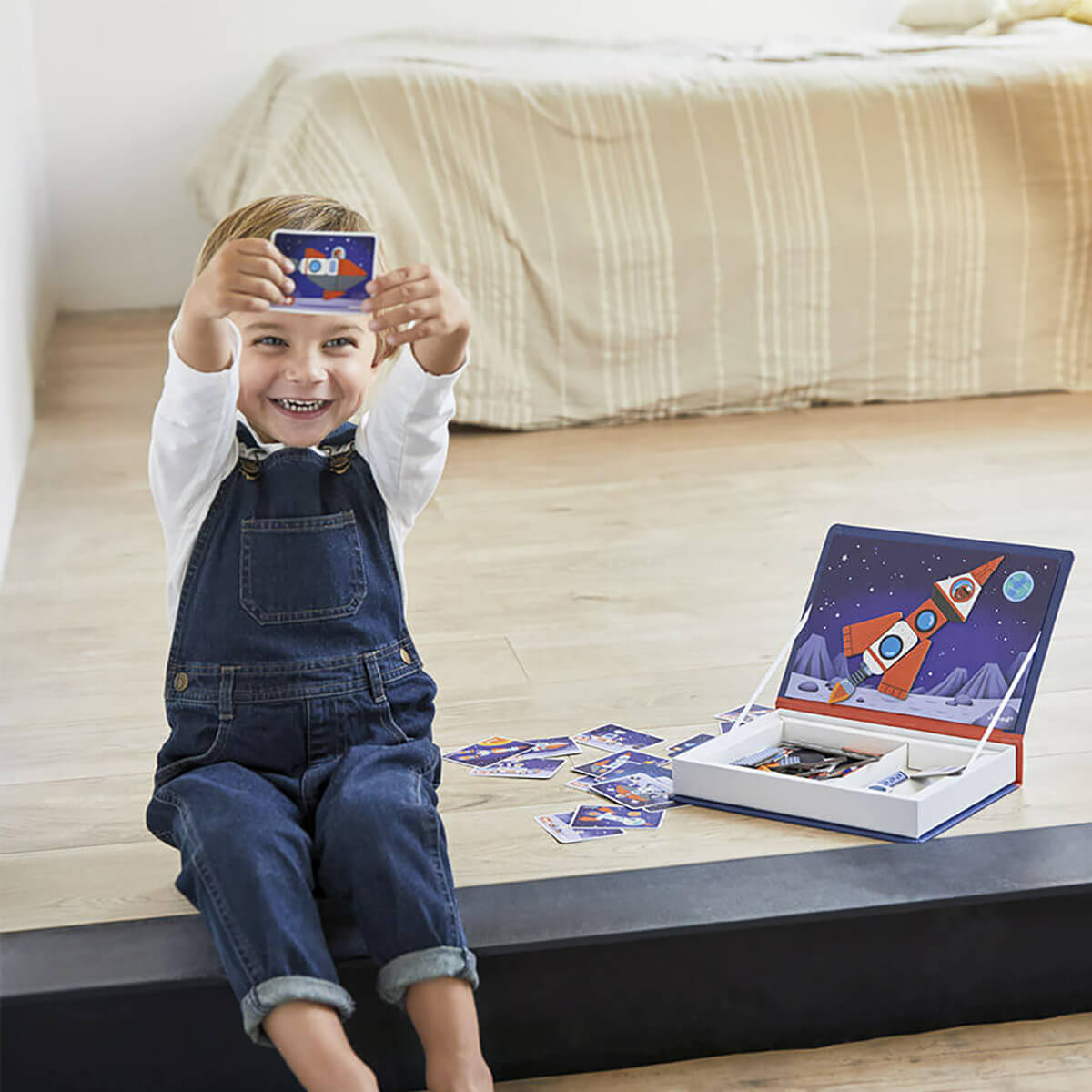 Cosmos Magneti Book by Janod. Magnetic educational game in cardboard. Includes 52 illustrated magnets and 18 template cards. Once the book is opened, the aim is to build the space vehicle indicated on the card using the magnets. All the magnetic pieces are completely interchangeable, so kids can have hours of fun coming up with all sorts of crazy pictures!
