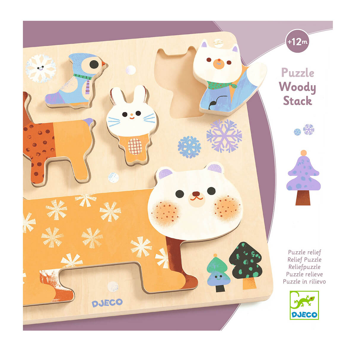 Woody Stack Wooden Puzzle by Djeco. Woody Stack is an easy-to-assemble wooden puzzle. The raised animal pieces can also stand and be stacked on top of each other to make a pyramid.