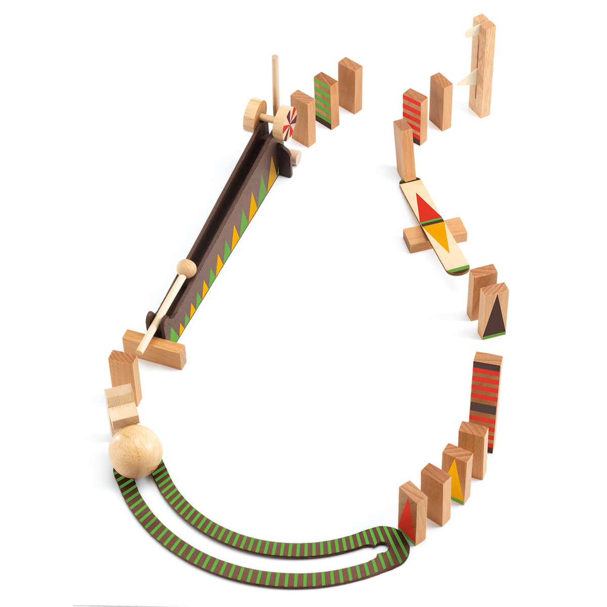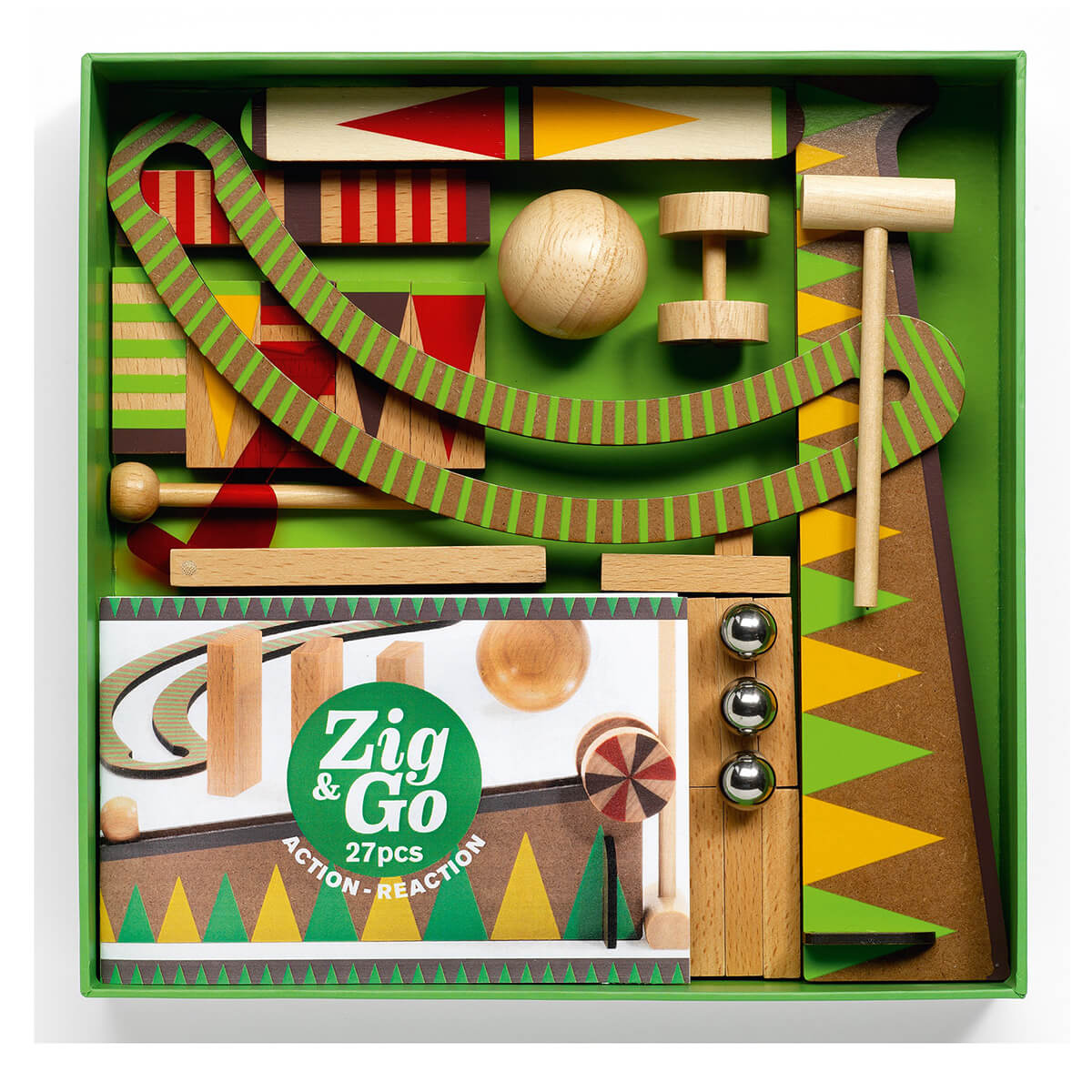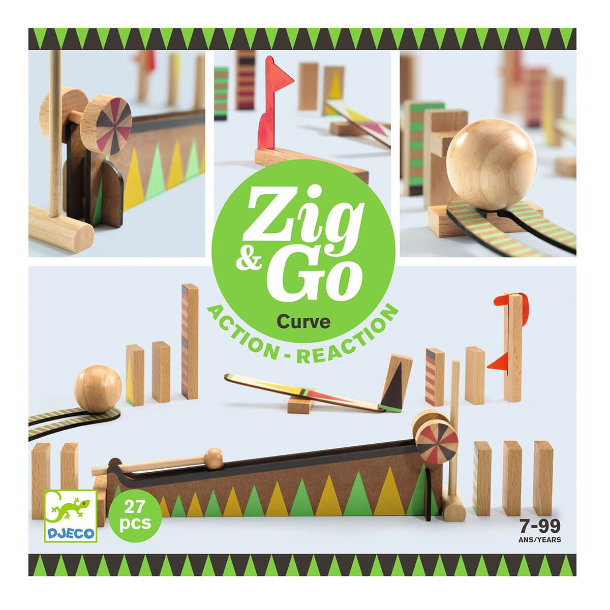 Zig and Go Curve 27 pieces by Djeco. 27 piece chain reaction puzzle and wooden construction set. This 27 piece set with wooden dominoes, ball and components will inspire creativity and build skills like perseverance. The child follows the 3 models in the booklet to build their journey or imagine others endlessly. This game for ages 7 and up is compatible with all the boxes in the collection to invent even more ingenious action-reaction courses.