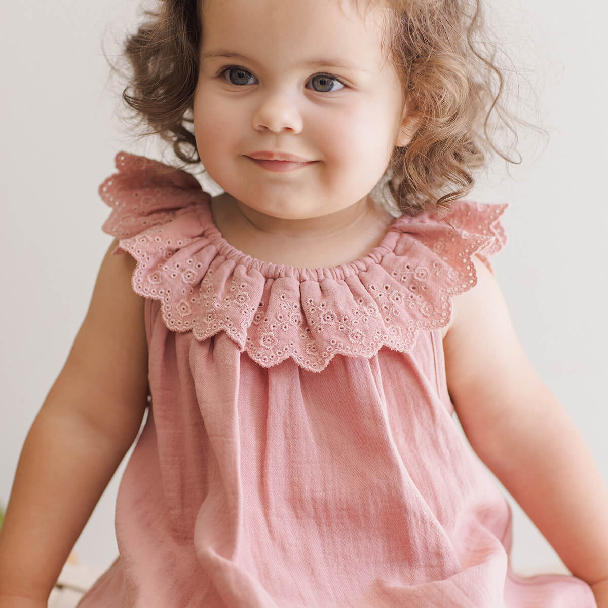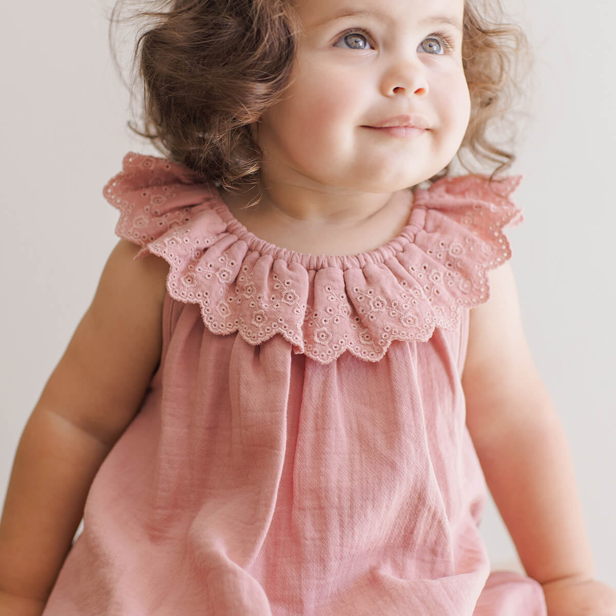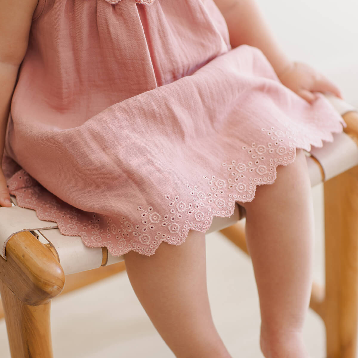 Isla Dress by Quincy Mae. Sleeveless dress made from soft woven cotton. Features scalloped embroidery on collar and skirt hem. All sizes include coordinating bloomers.