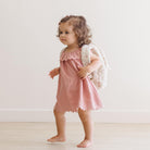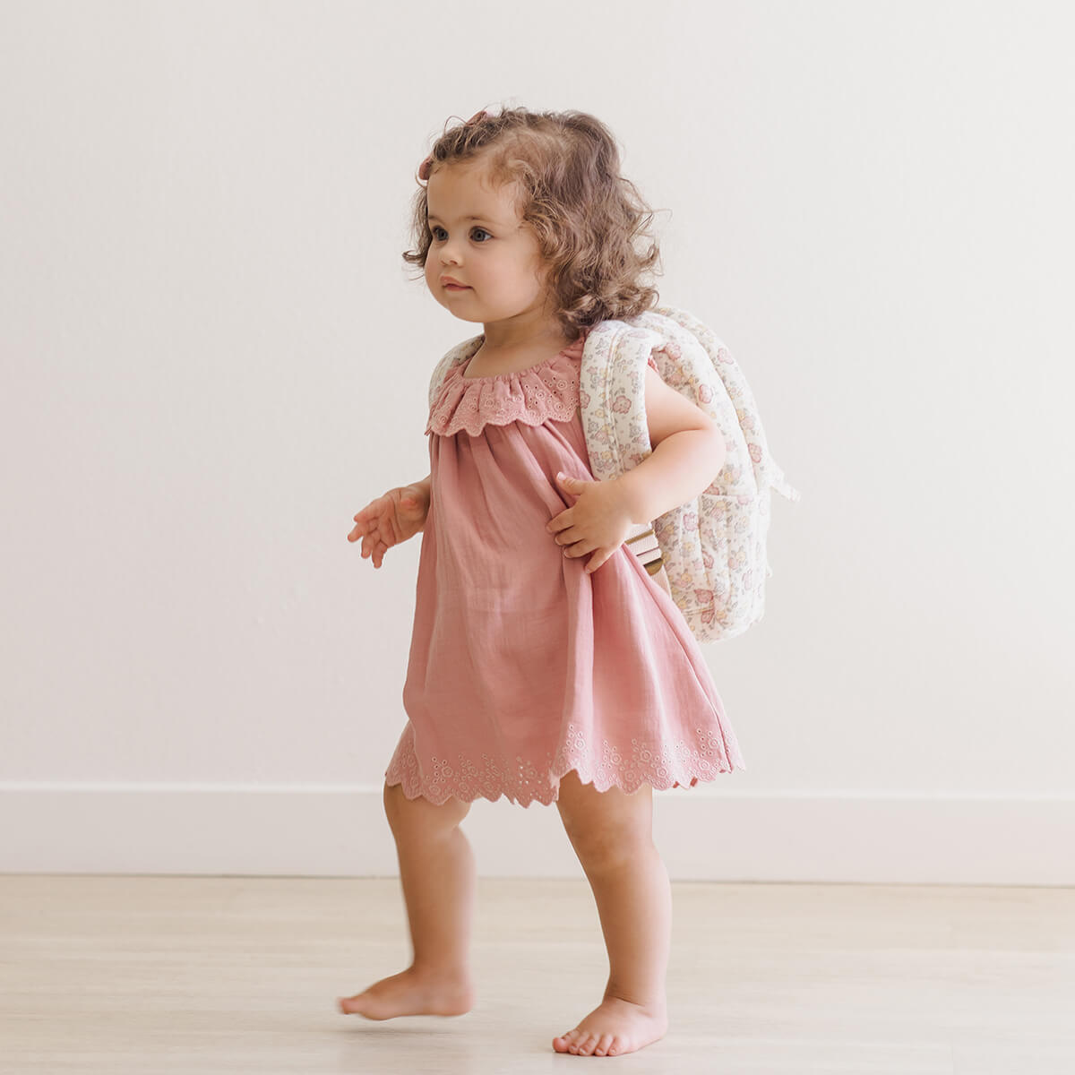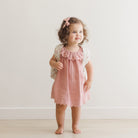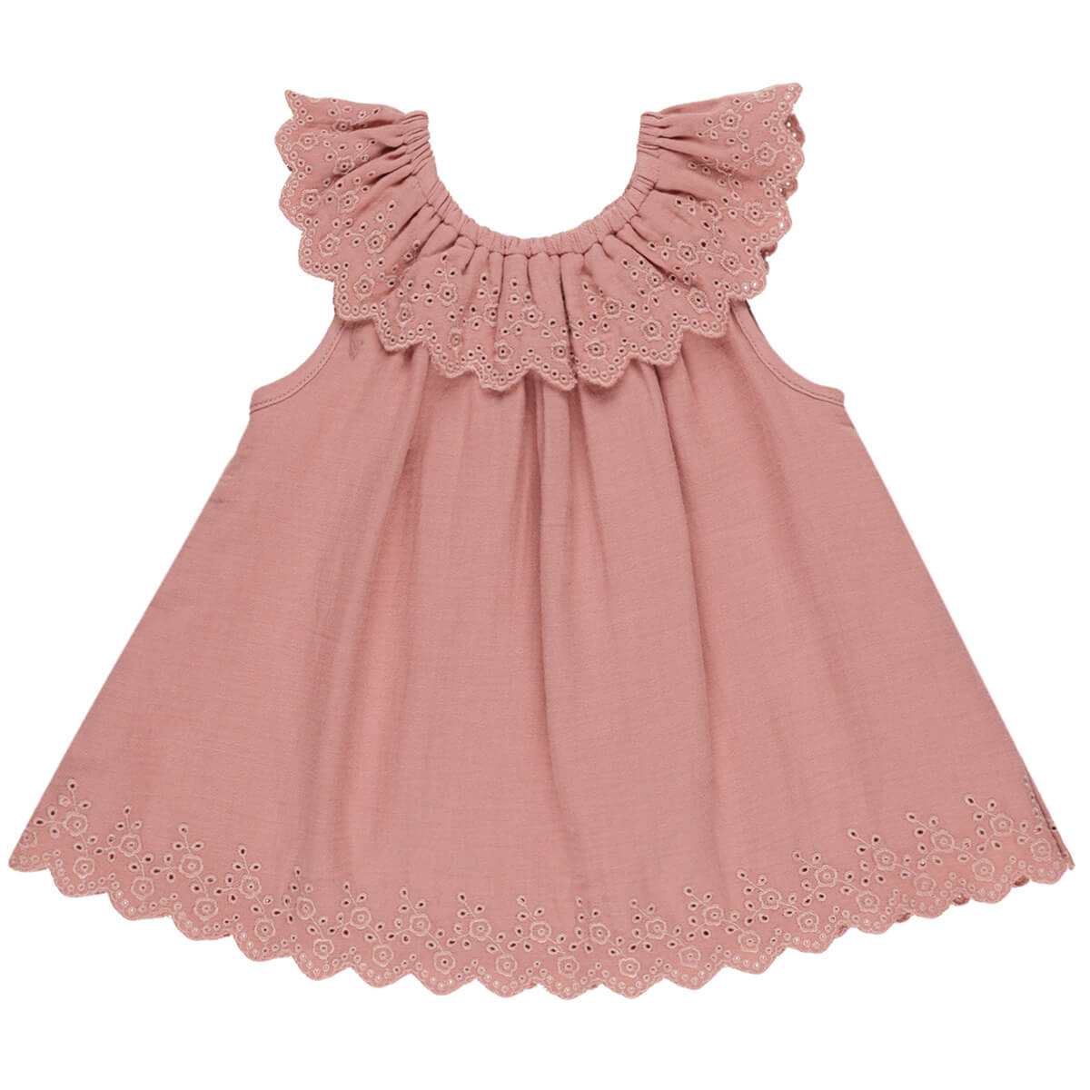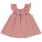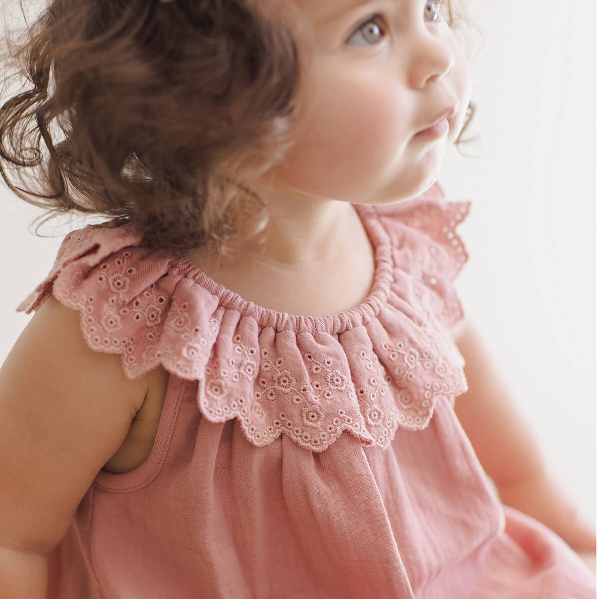 Isla Dress by Quincy Mae. Sleeveless dress made from soft woven cotton. Features scalloped embroidery on collar and skirt hem. All sizes include coordinating bloomers.