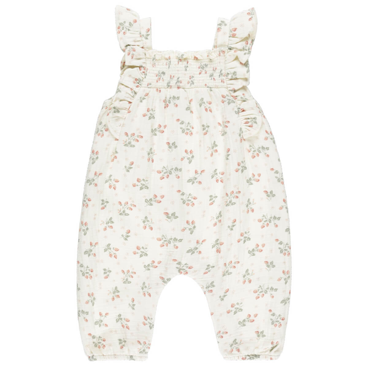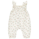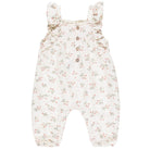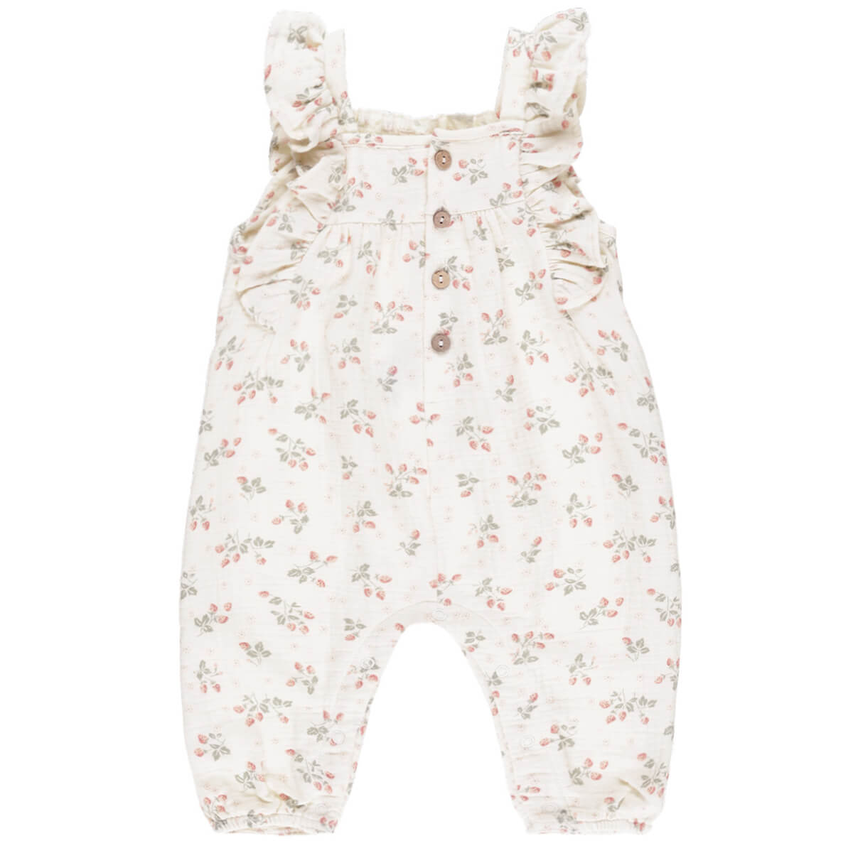 Nova Romper by Quincy Mae. Sweet full length romper with front button placket and ruffle strap detail. Designed with bottom snaps for easy changes.