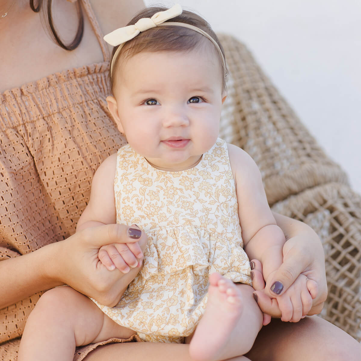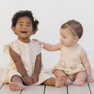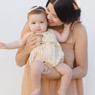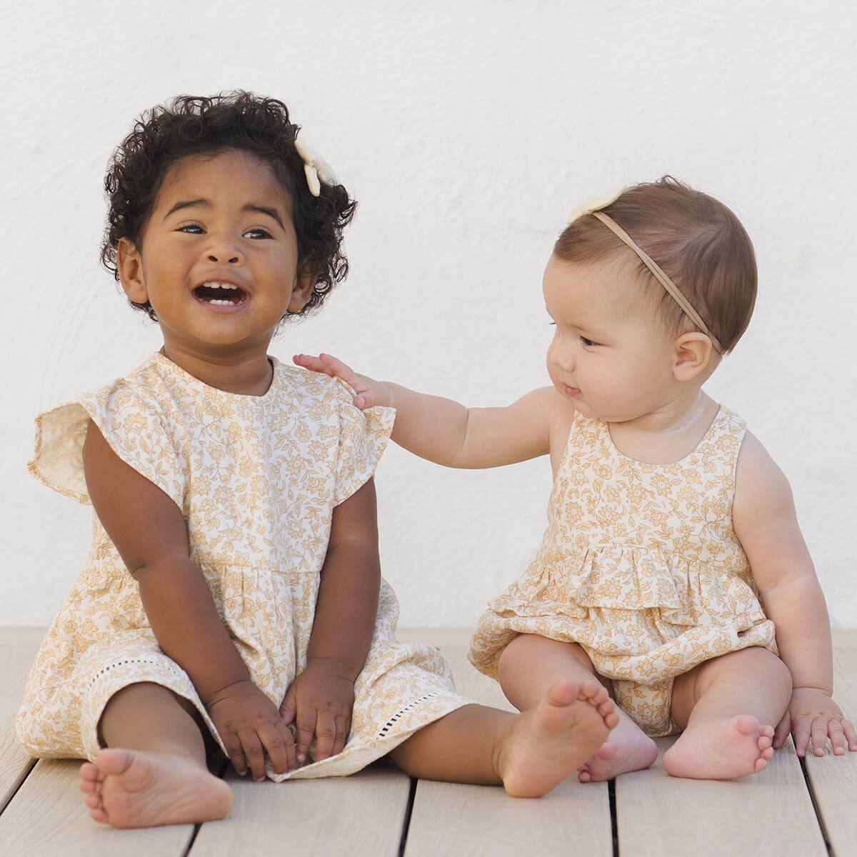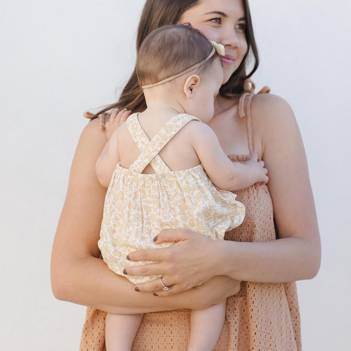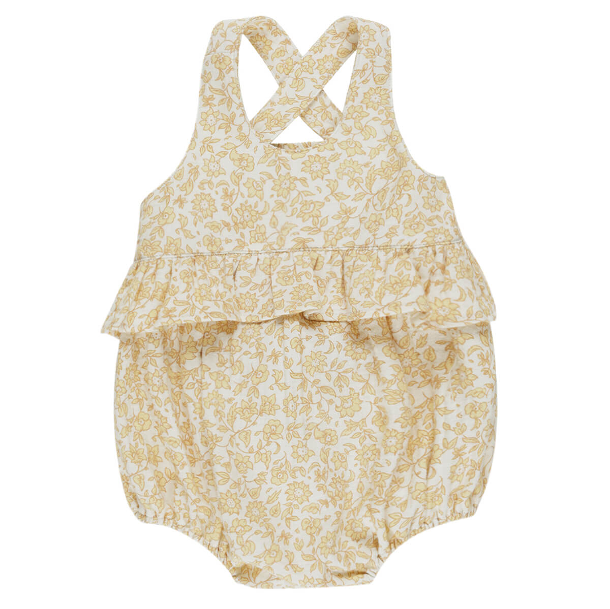 Penny Romper by Quincy Mae. This baby romper features a bubble silhouette, ruffle waistline detail, and adjustable criss-cross straps with bottom snaps for easy changes.
