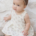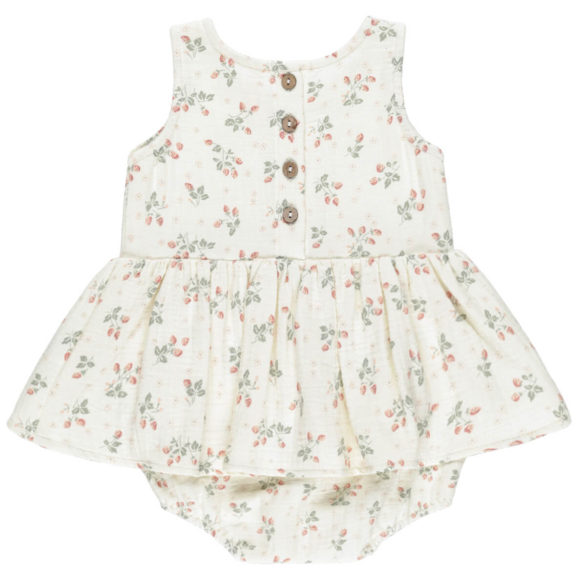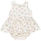 Skirted Tank Romper by Quincy Mae. Skirted tank one-piece in organic cotton gauze fabric, with a button back closure. Designed with bottom snaps for easy changes.