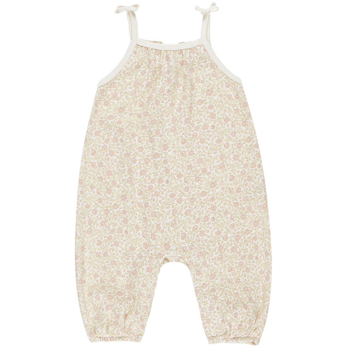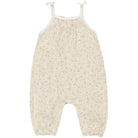 Smocked Jumpsuit by Quincy Mae. Spaghetti strap jumpsuit with fixed ties, a smocked back. elastic leg openings, and snaps down the inseam for easy changes - a go-to this season for your little one!