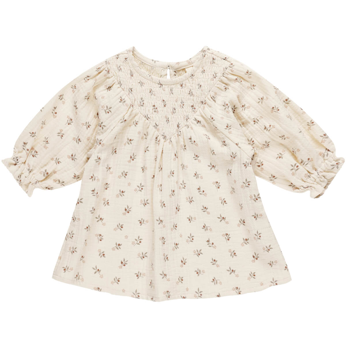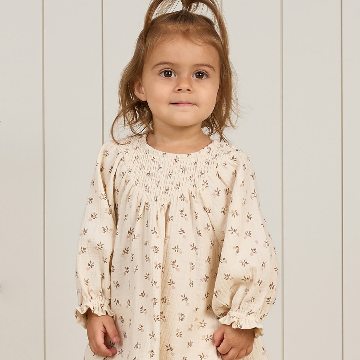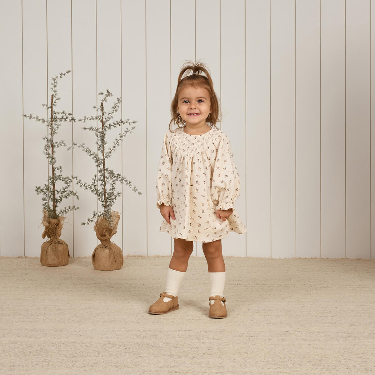 V Smocked Dress by Quincy Mae. Smocked long sleeve dress with smocked neckline. Button back closure for easy changing.