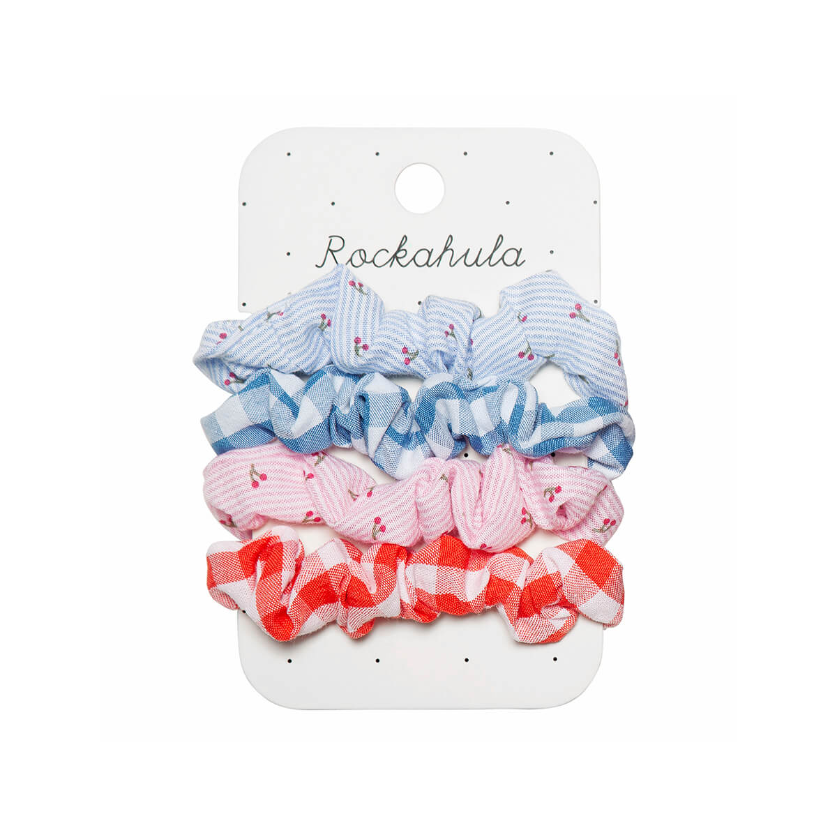 Cherry Gingham scrunchie set by Rockahula Kids. A pack of four sweet and wearable scrunchies, each in a different beautiful fabric. Featuring a striped cherry print in both blue and pink, and a bright gingham fabric in blue and red.