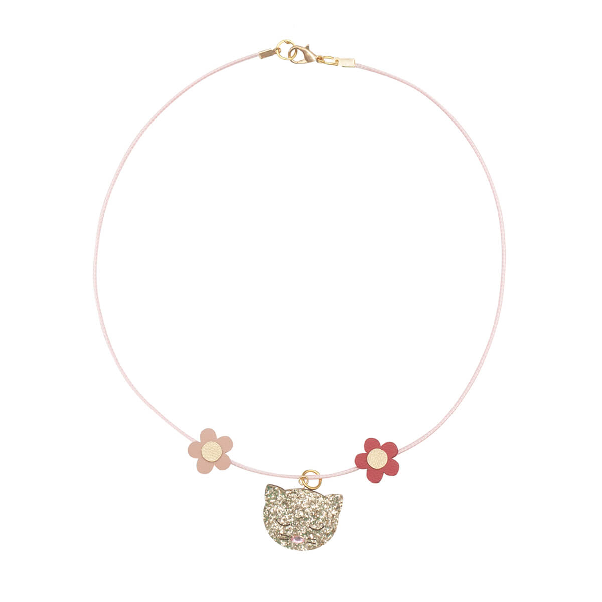 Clara Cat necklace by Rockahula Kids. This necklace is puuur-fect in every way! Featuring a glittery gold Clara cat and sweet PU flowers set on a pretty pink cord with a lobster clasp fastening and extender chain to ensure the perfect fit.