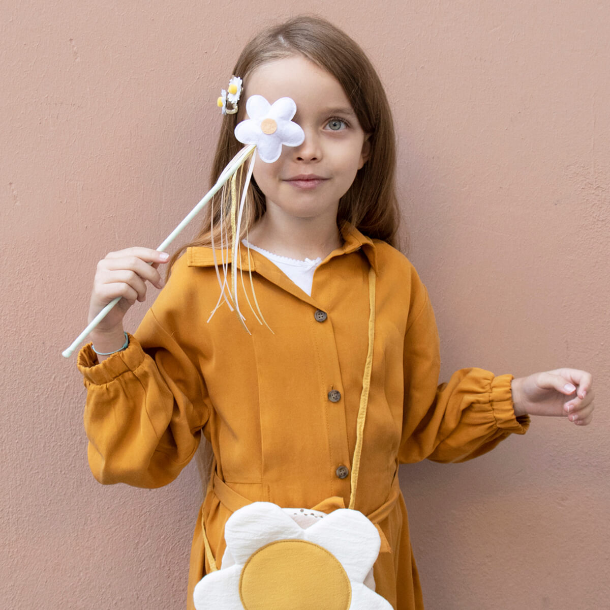Daisy wand by Rockahula Kids. Magic up some flower power with this beautiful daisy wand. With a ribbon-wrapped centre stem and soft coloured grosgrain ribbon streamers, it's perfect for spring and summer adventures, imaginative play, or a fun addition to the dressing up box!
