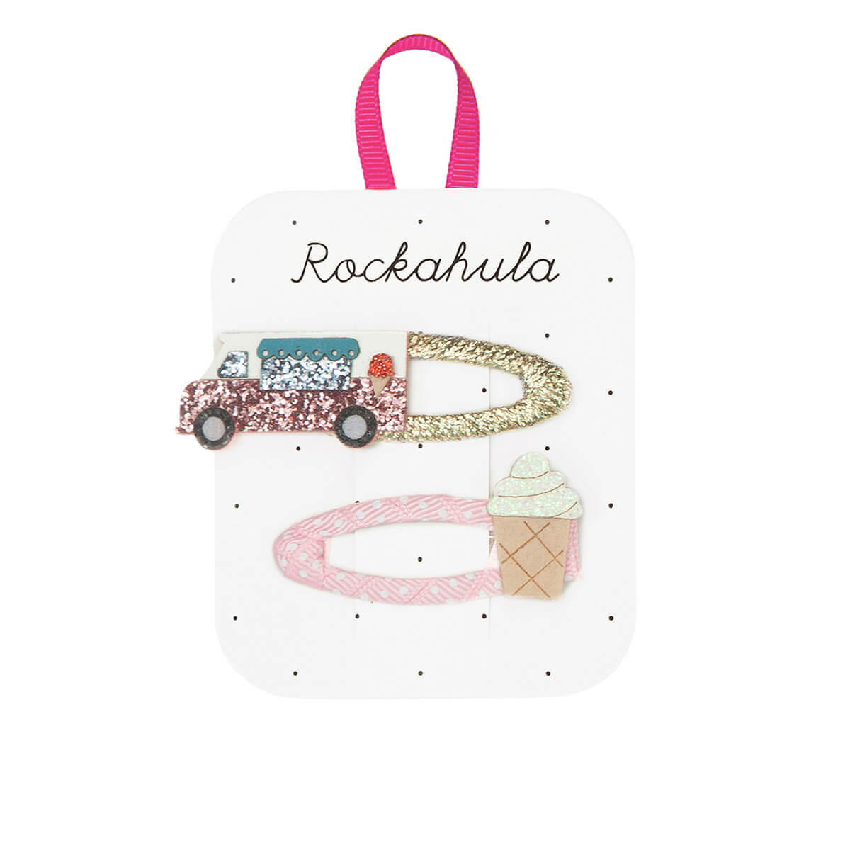 Ice Cream Van Hair Clips by Rockahula. Hear the melody of our Rockahula ice cream van! This pack of two clips feature a vintage ice cream van and an ice cream waffle cone. Each secured to a ribbon wrapped snap clip.