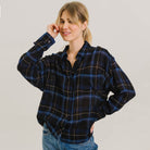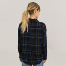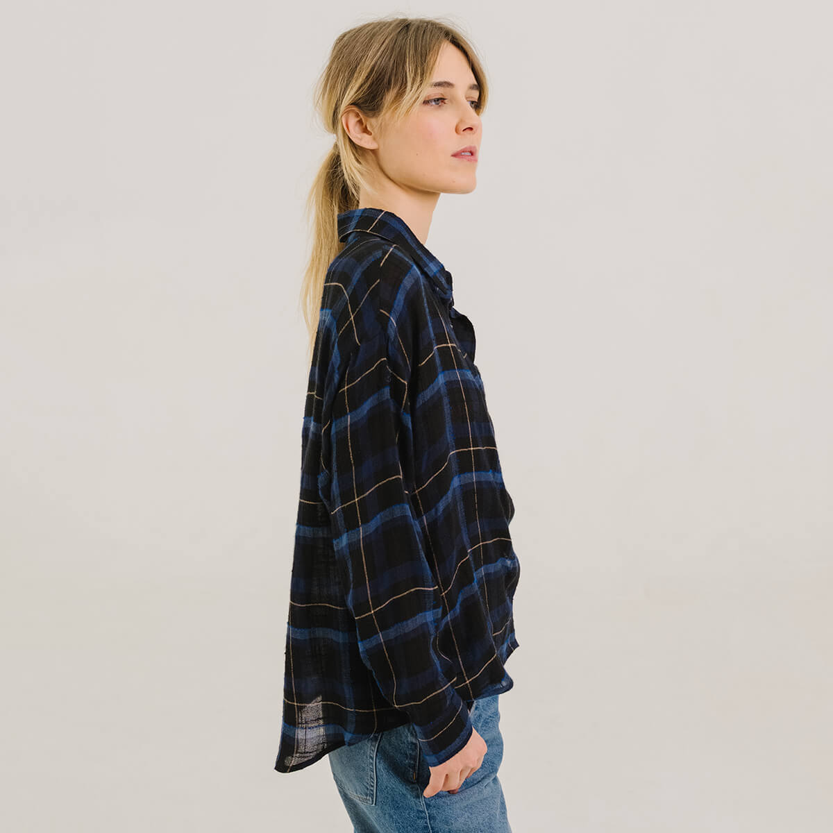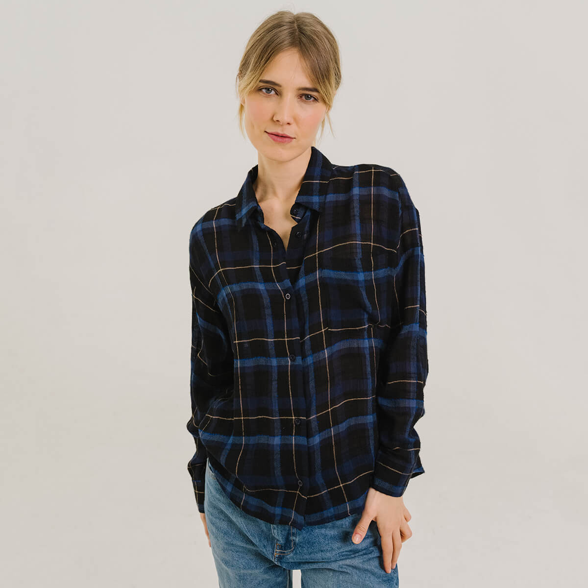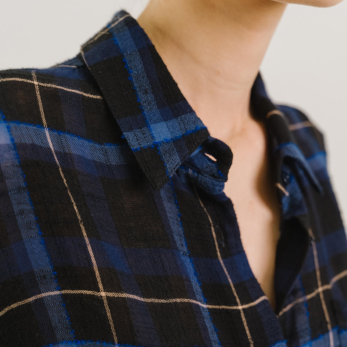 Elisa Shirt by Sacrécoeur. Black long-sleeved shirt with blue and beige checks, made from cotton and viscose. Inspired by a men's shirt, it features a slightly oversized cut with a dropped armhole for a relaxed silhouette. Its classic collar, chest patch pocket, and exposed buttoning give it a timeless touch. Buttoned cuffs finish.