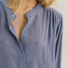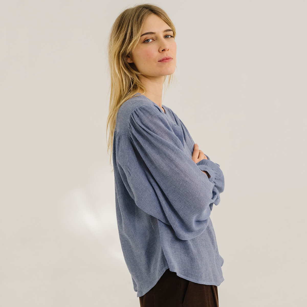 Gladis Shirt by Sacrécoeur. Plain, long-sleeved blouse crafted from a blend of viscose and wool in heather blue. Its loose, flowing cut is accentuated by a fine mandarin collar and gathers at the front, back, and cuffs. The slightly puffed sleeves add a light and elegant touch to the silhouette, while the buttoned cuffs add a delicate finish.