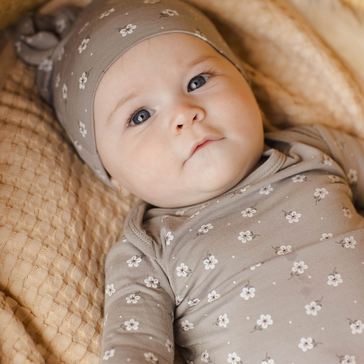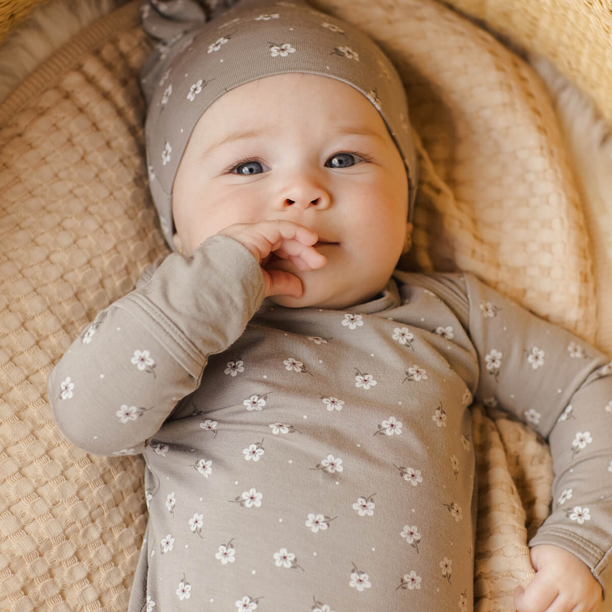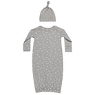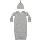 Bamboo baby gown and hat set by Quincy Mae. Baby gown with elastic bottom opening and fold over hand-mitts in a soft and stretchy bamboo fabric. Includes a coordinating knotted hat.