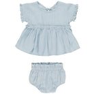 Juniper set by Quincy Mae. The sweetest look for the season, this soft chambray outfit includes a ruffle trim blouse and matching bloomers. Designed with gathered ruffled hems for cute added detail.