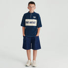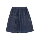 Shorts by True Artist. These dark denim shorts are designed with elastic waistband and patch pockets that feature a TA logo embroidered in contrast color. They have a loose fit. Made in Spain.