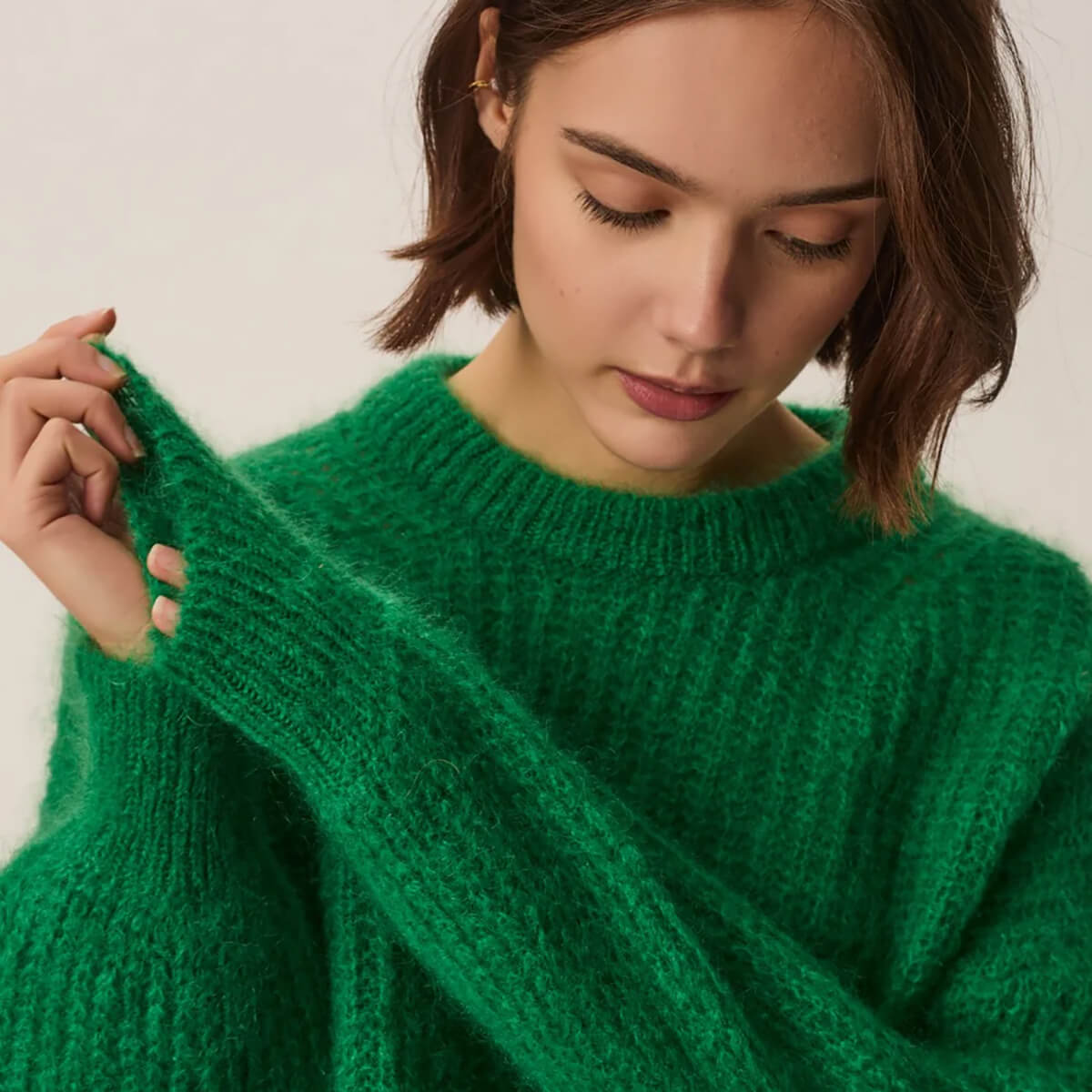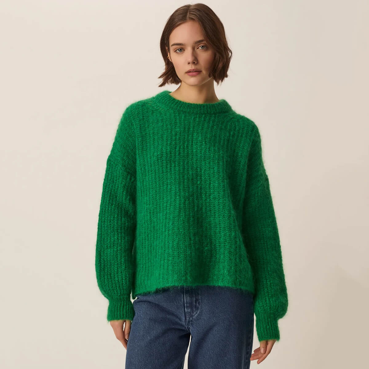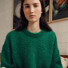 Burma Sweater by Des Petits Hauts. Made from Kid Mohair and Merino wool, Burma is the warm and cozy crew neck sweater that goes with everything. With its oversized cut and pearl rib knit for an ultra-cozy, fluffy feel, this chic and versatile piece can be worn on its own with a scarf for the early seasons or under a coat for the depths of winter.