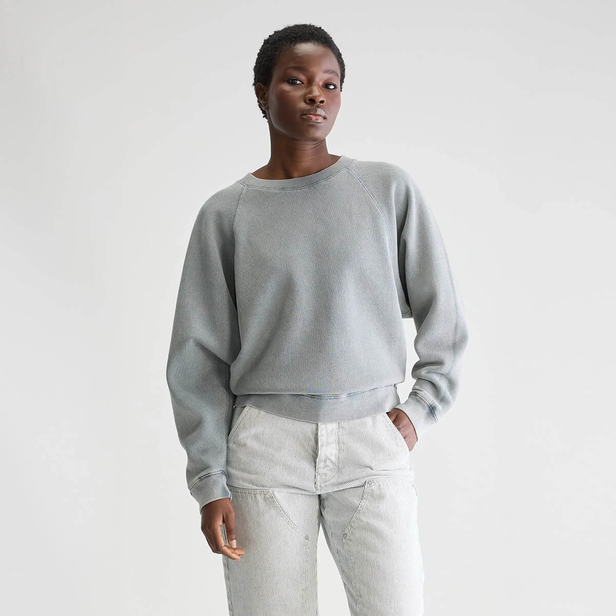Fella Relaxed Fleece Sweatshirt by Bellerose. Relaxed sweatshirt with raglan sleeves and tone-on-tone BB embroidery on the left side. Crew neck and rib trims. Make from a lightweight fleece in grey with a denim wash finish.