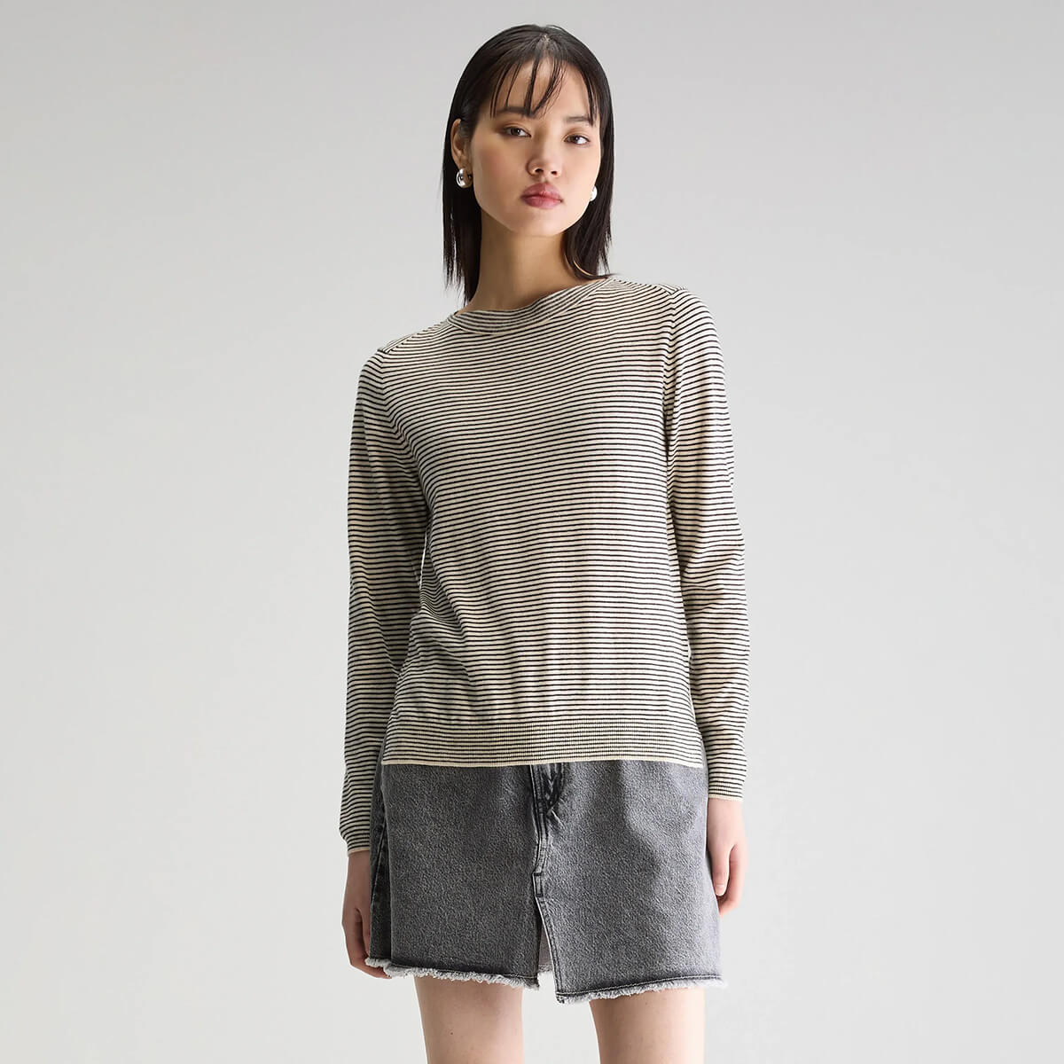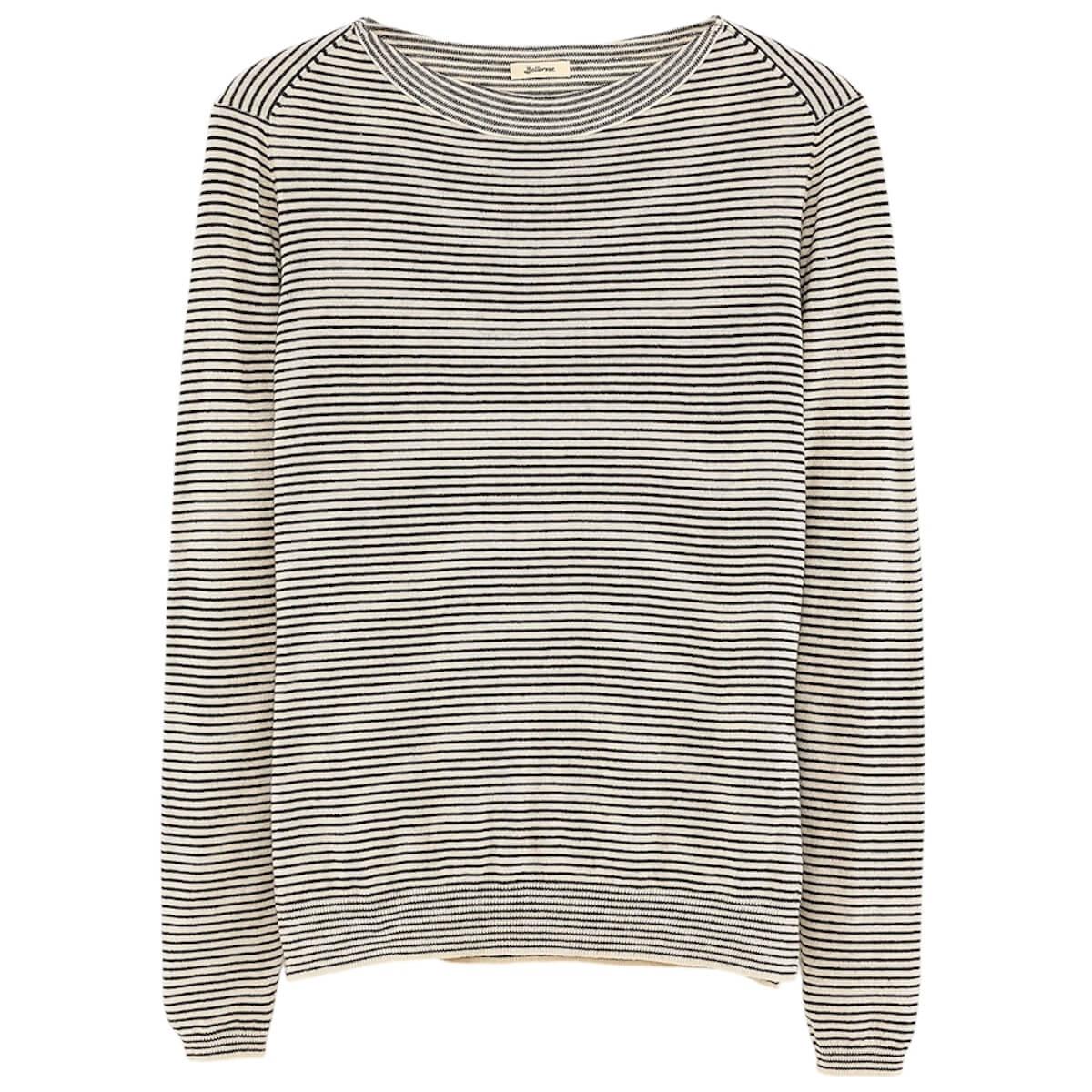 Gop Boatneck Sweater by Bellerose. Slim fit sweater with long sleeves and boat neck crafted from a cotton/wool blend with a micro stripe.