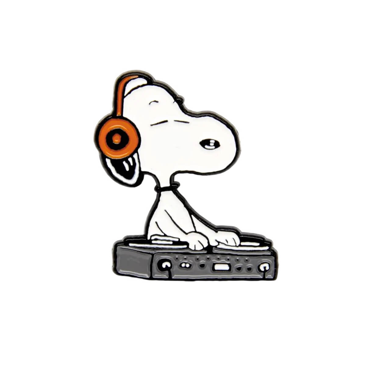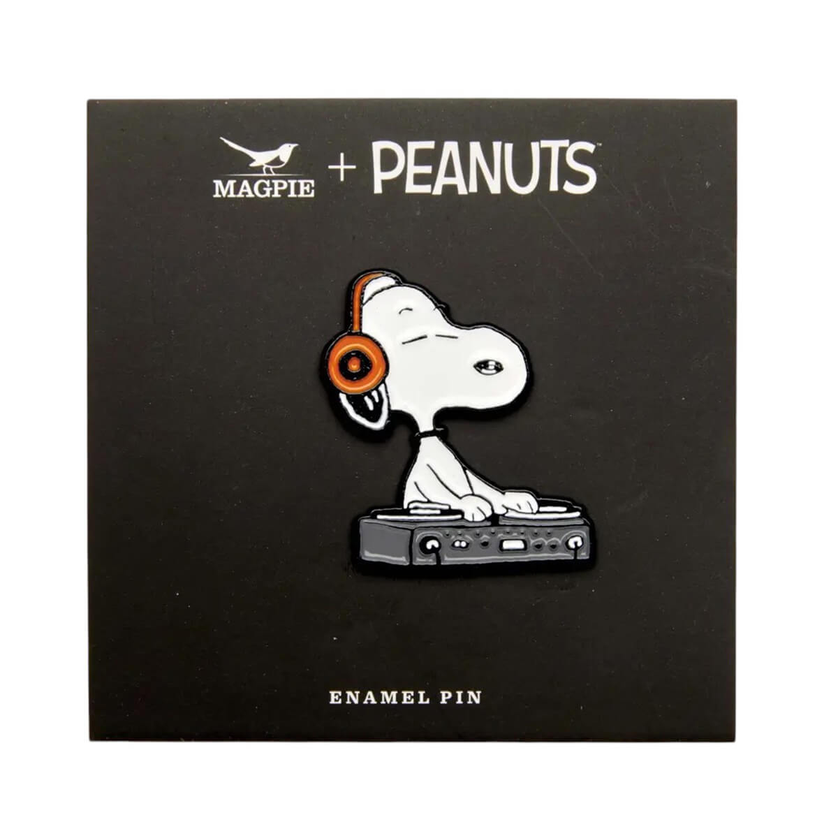 Dj Snoopy Pin by by Magpie. Black nickel plated brass pin with coloured enamel. Pin is approx 30mm high. Comes with backing card packaging.