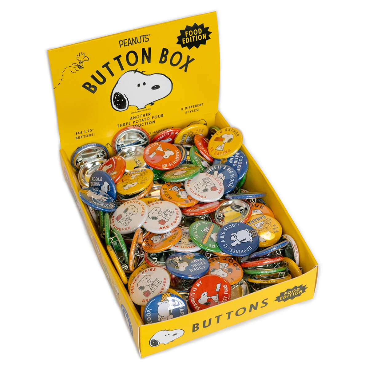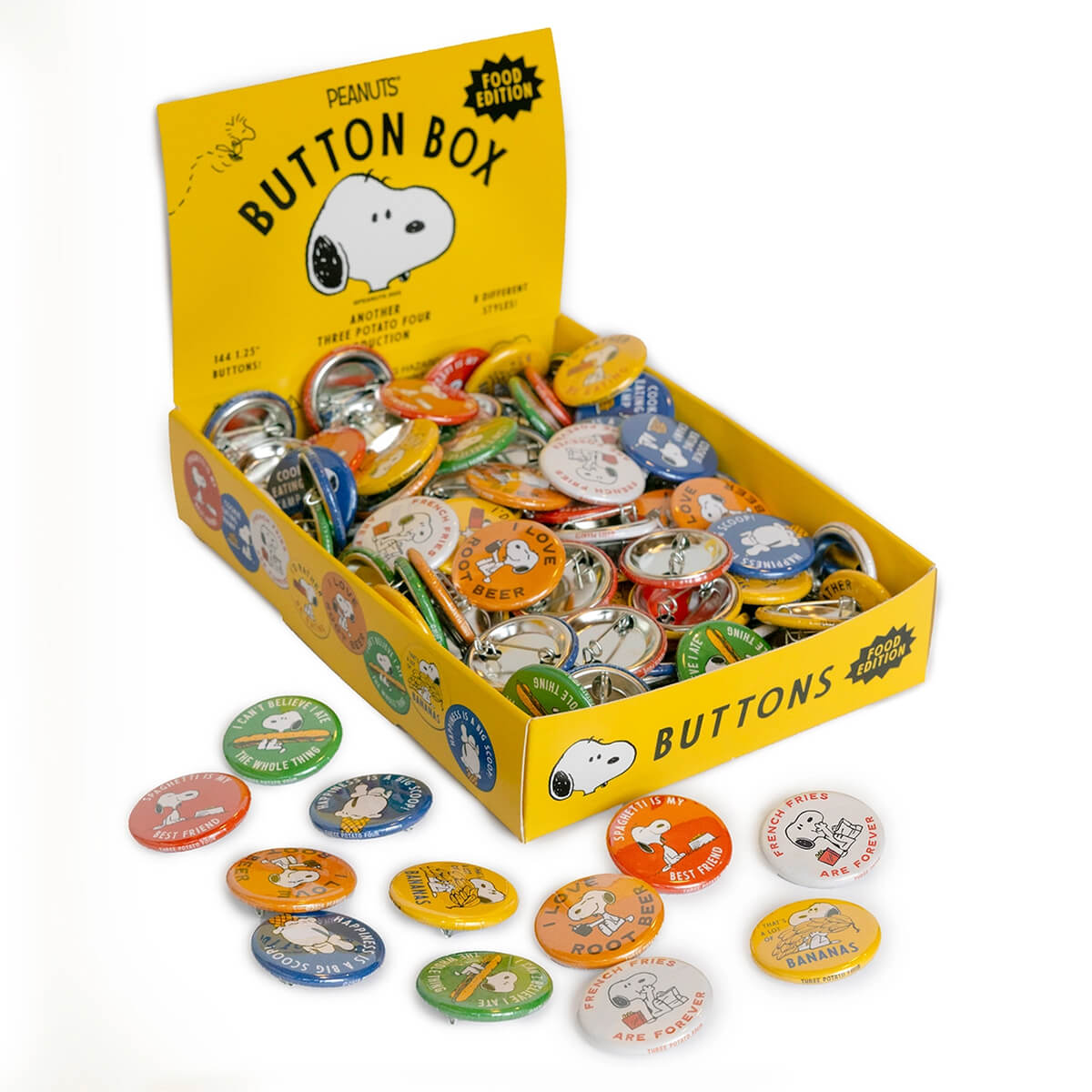 Snoopy Assorted Button Badges (Food Edition) by Three Potato Four X Peanuts. Vintage inspired button badges proudly made in Portland, Oregon with recycled steel and paper. The Snoopy Food Edition badges come in eight different designs featuring your favourite beagle and assorted favourite Americana foods and eating slogans.
