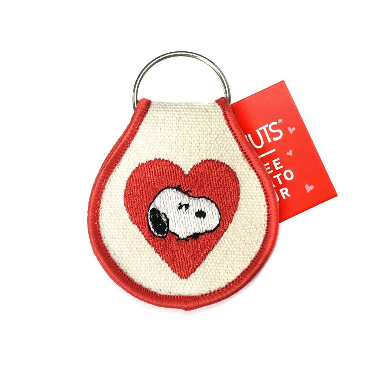 Snoopy Heart Patch Keychain by Three Potato Four X Peanuts. Super cute double sided embroidered keyring with classic vintage inspired Snoopy face on an embroidered red heart. Made with high-quality materials for a durable, long-lasting accessory.