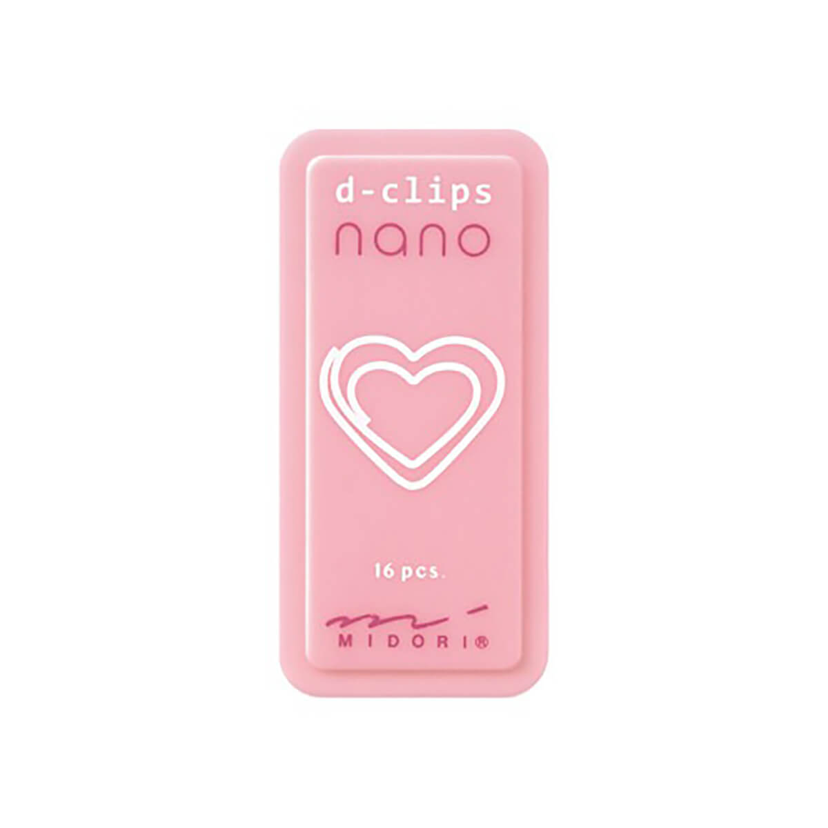 Heart D-clip Nano paperclips by Midori. Tiny shaped metal paper clips in a matchbox sized handy solid storage box with sliding lid. The Nano paperclips are a new designed tiny clip that combines design and functionality. A Japanese stationery classic.