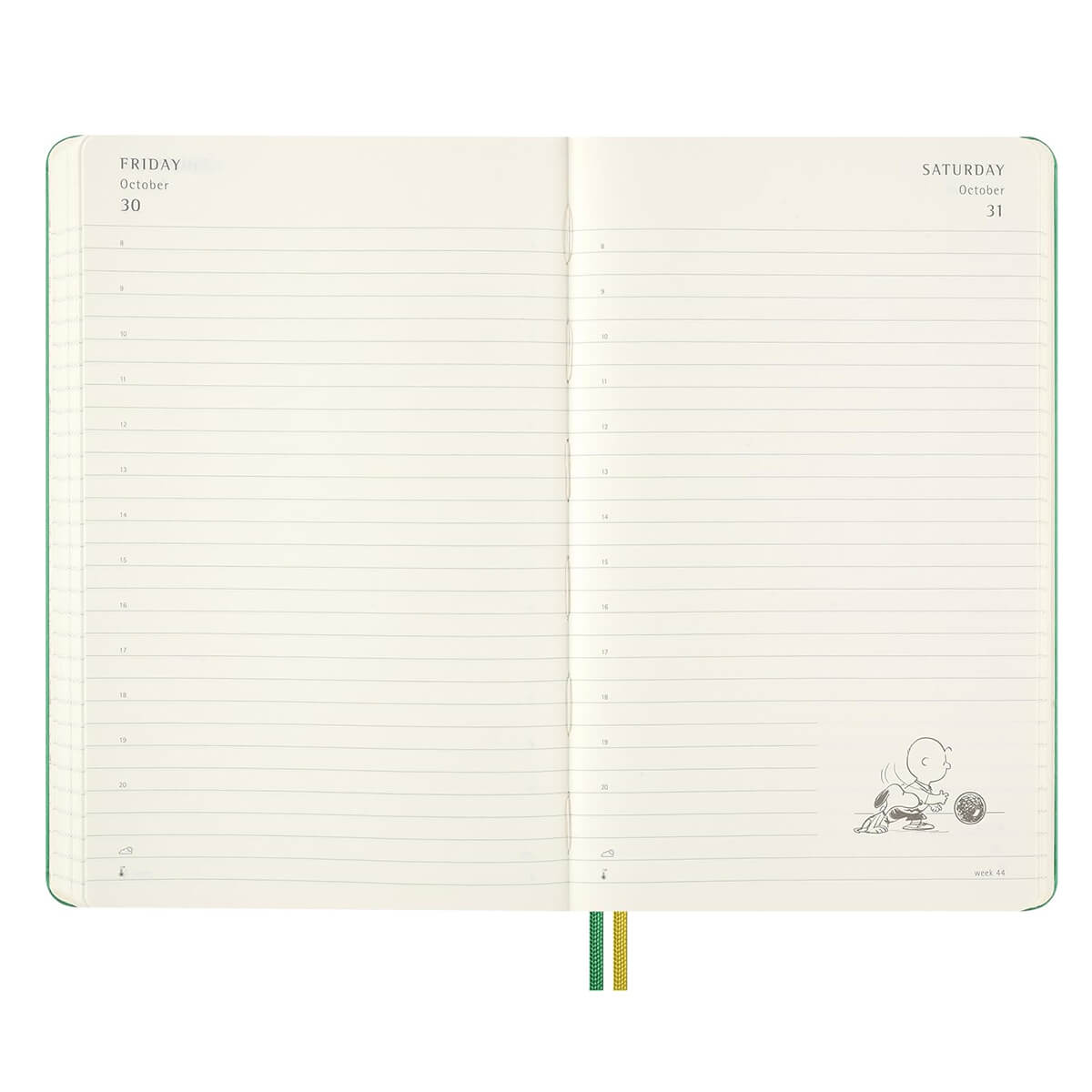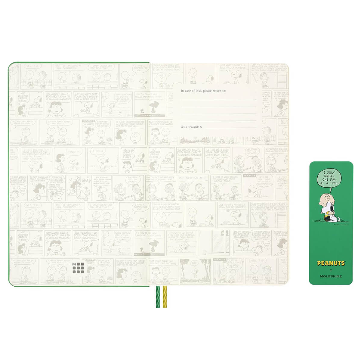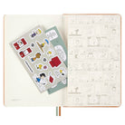 Peanuts 12 Months daily Planner 2026 Diary by Moleskine. Discover Peanuts illustrations with this daily planner covering 12 months from January to December 2026. Day to view per page. Includes an expandable pocket, the "In case of loss" label, cute Peanuts gang stickers to personalise your diary and useful tools such as a calendar, goal-setting pages, and travel planning sections.