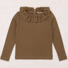 Paloma Top by Misha & Puff. A long-sleeved slim-fit top in soft organic Pima cotton, featuring a gathered ruffle neck with contrast merrowed edge and snap closure at the back neck.
