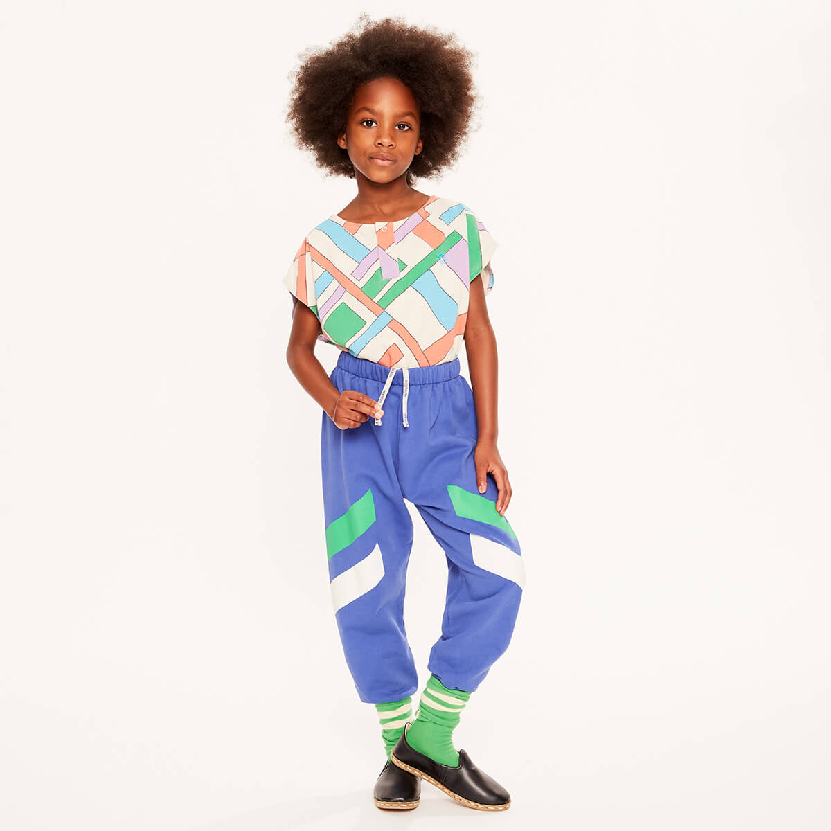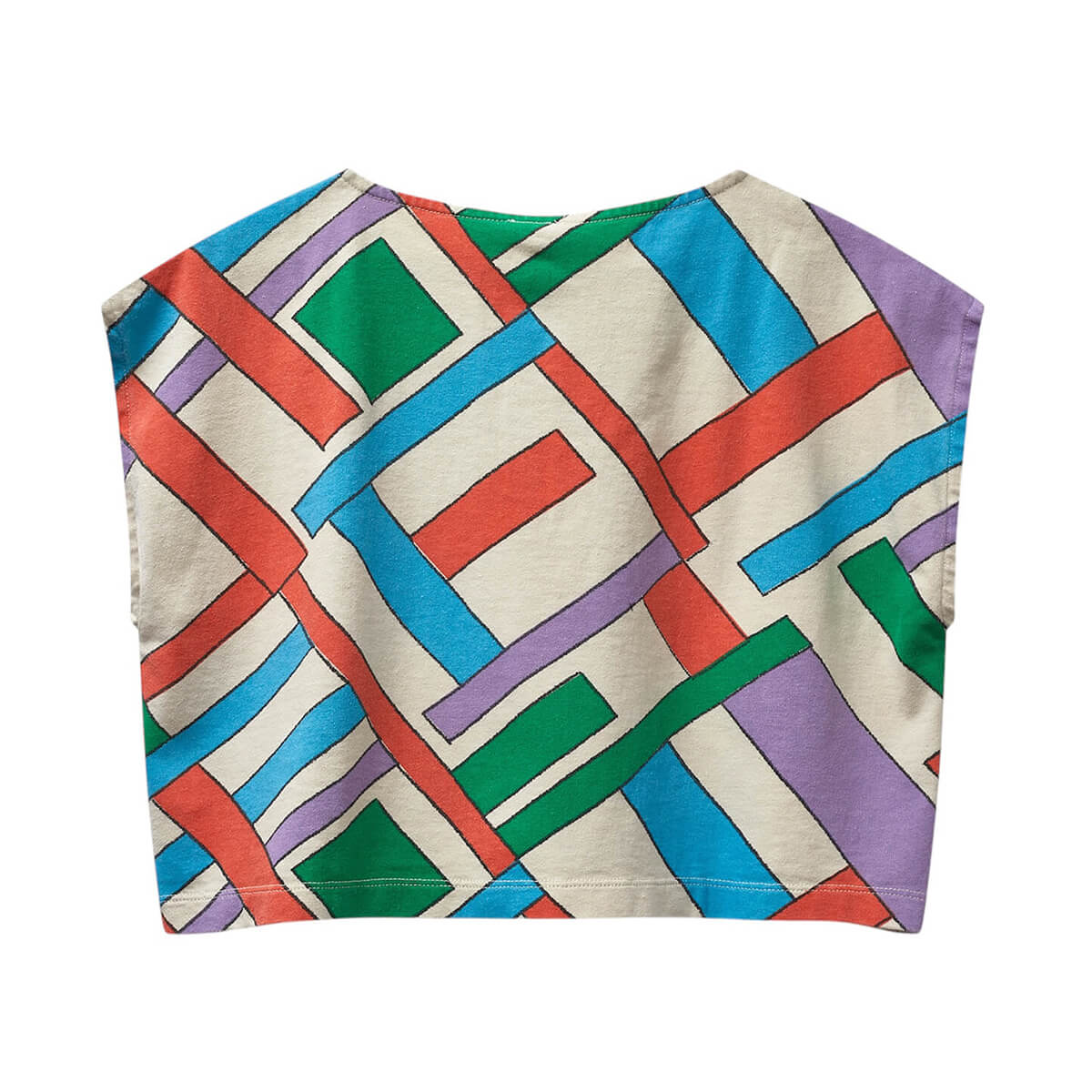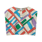 Vela Top by Wynken. Designed with a relaxed, boxy fit this top is as stylish as it is comfortable. The sleeveless design with deep armholes and a round neckline ensures freedom of movement, while the snap-fastening placket at the front adds a practical yet chic touch. Made from soft organic jersey and featuring a bold kite block print, this eco-friendly piece is perfect for sunny days and playful outings. The friendly Wynk logo is embroidered on the chest.