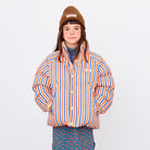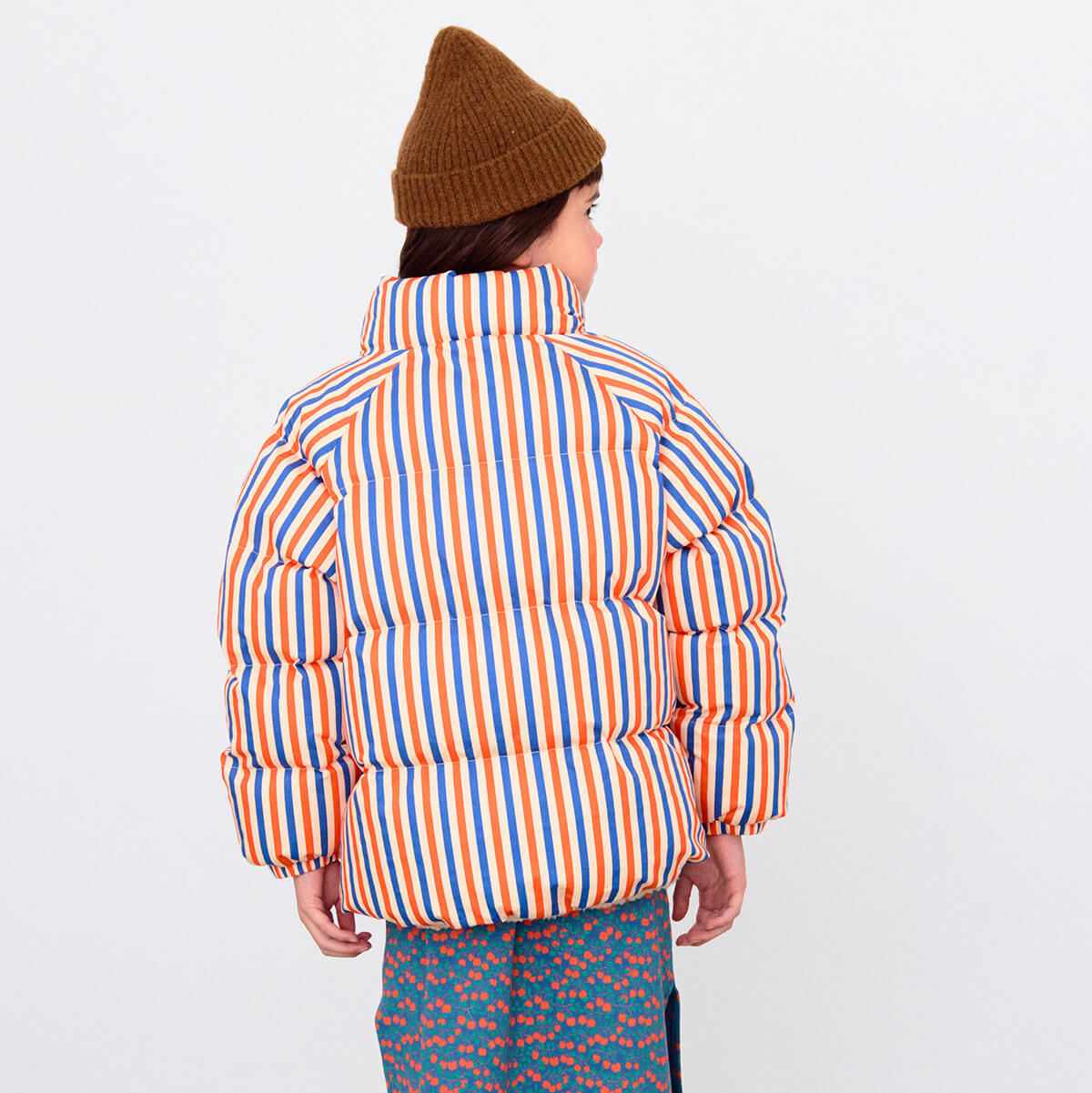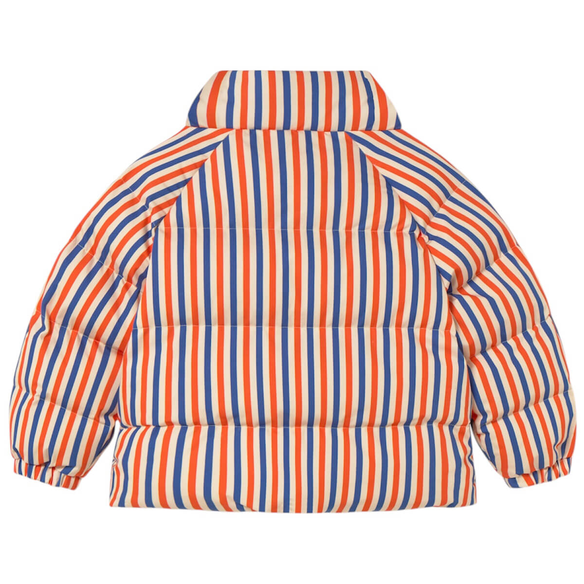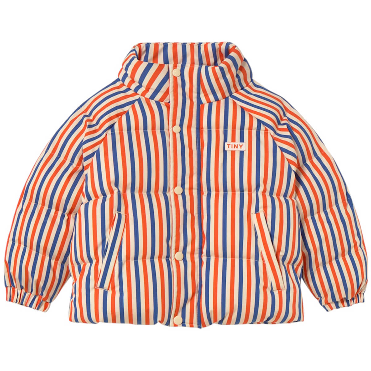 Stripes Short Padded Jacket by Tinycottons. This super warm stripes padded coat is made from 100% cotton with an ECO WDR (Durable Water Repellent) finish and a protective coating offering water resistance of 500-800pa. Designed with a high neck and full zip closure, it features an additional snap front placket and sherpa-lined pockets for extra warmth. Perfect for everyday wear, this jacket combines comfort and practical style for cooler days.