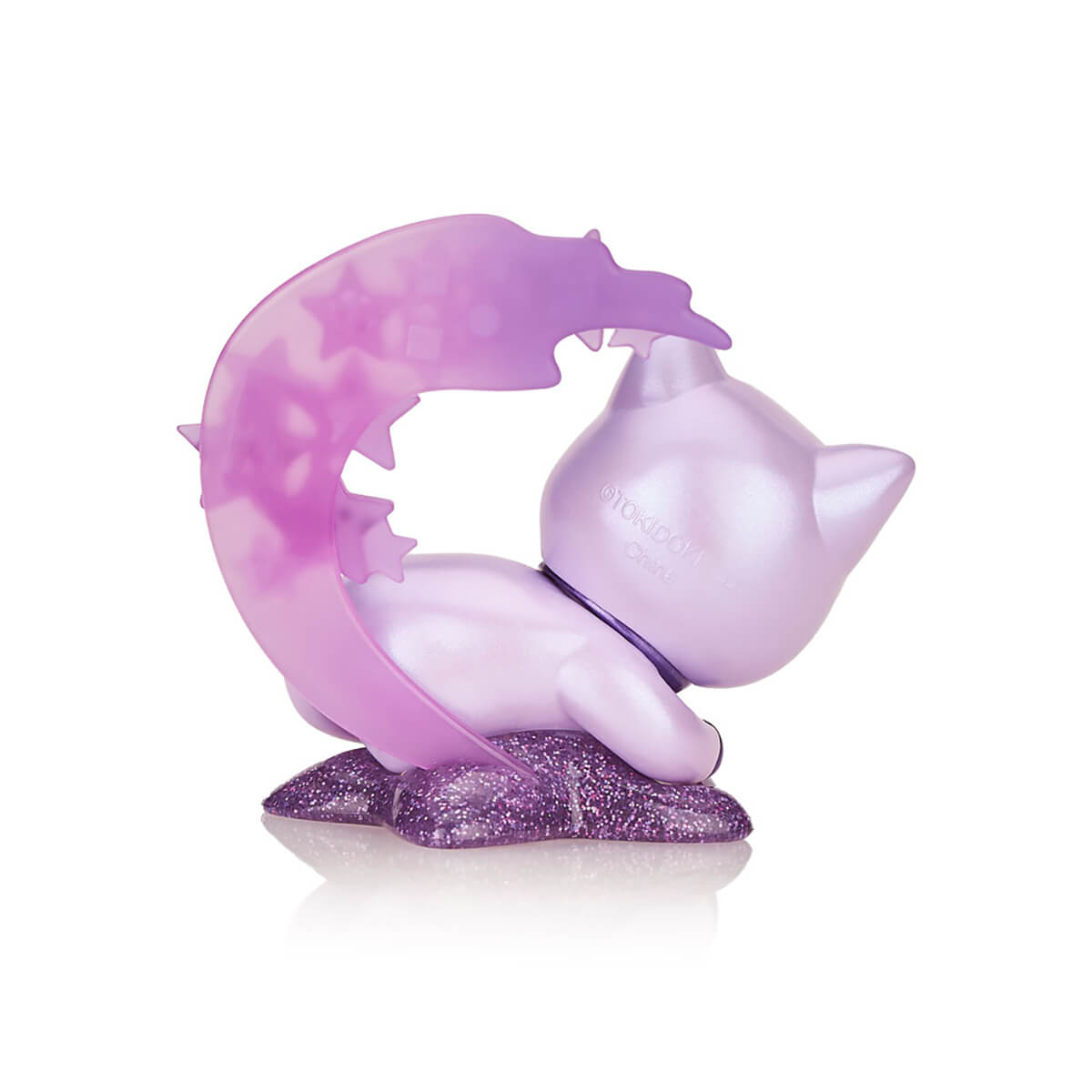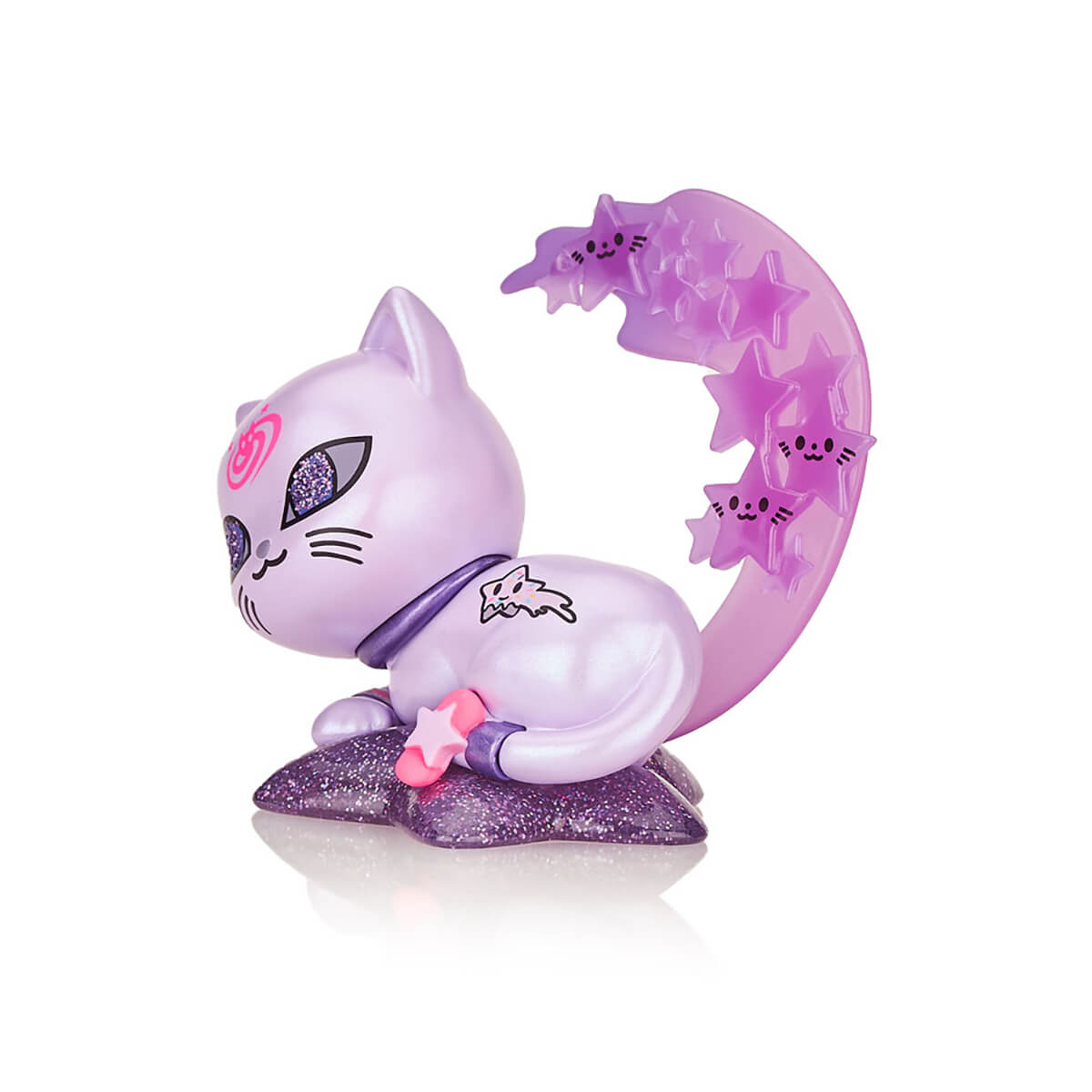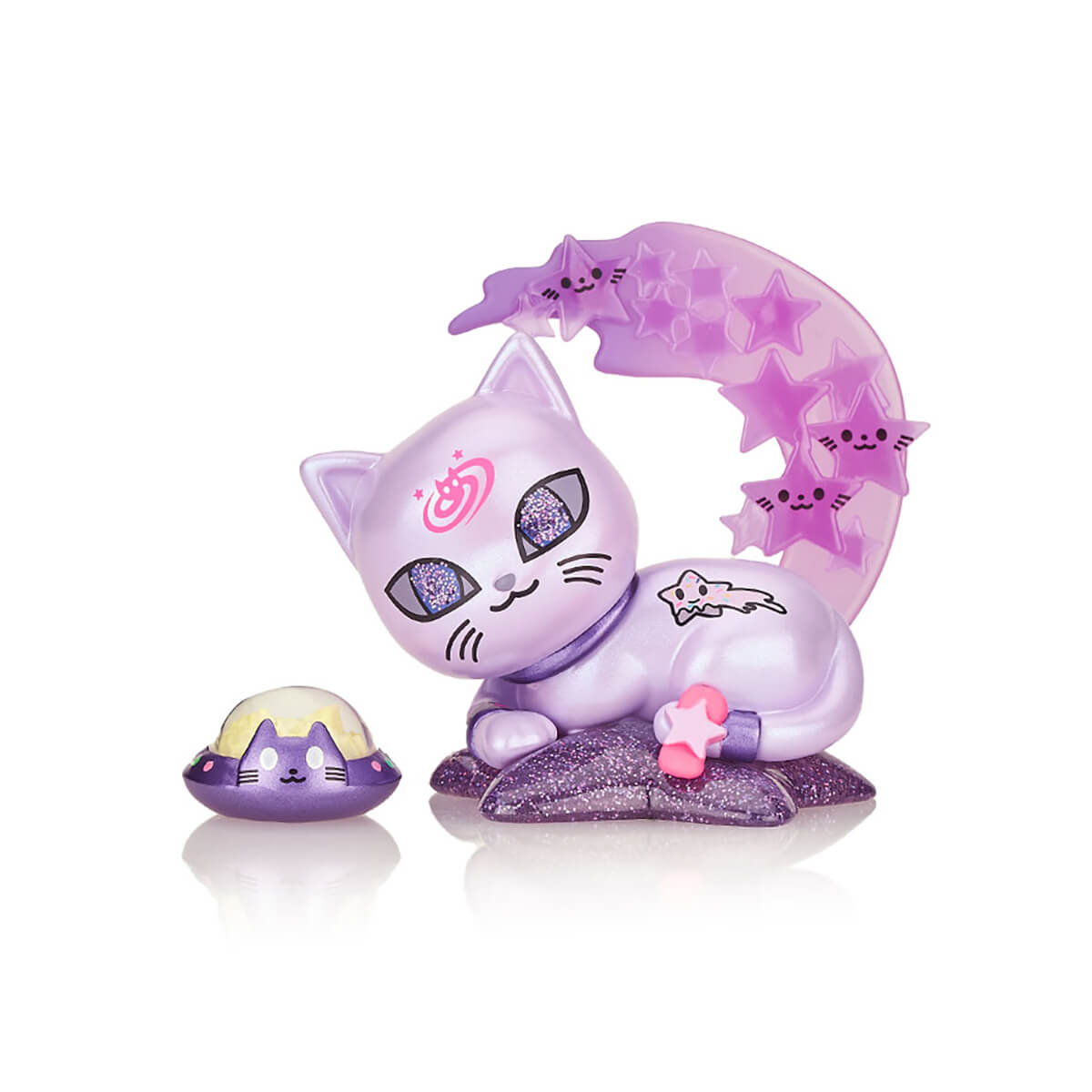 Galactic Cats Star Critter Figure by Tokidoki. The Galactic Cats have taken us to their leader! Star Critter comes in peace, with glow in the dark features and kitty UFO bowl full of treats. Curled up on a pillow with a shooting star backdrop, along with metallic and glitter finishes - this feline friend is sure to steal your heart. Grow your collection to the moon and back with the Galactic Cats Limited Edition Star Critter. This is a imited edition collectible figure with special iridescent chameleon paint, glitter and metallic details. Shooting stars on the tail which glow in the dark.