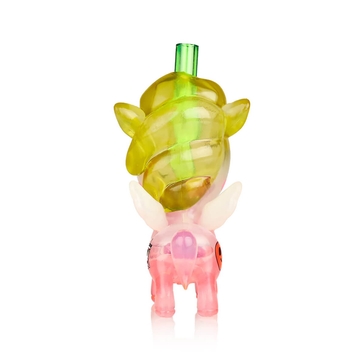Strawberry Matcha Unicorno Figure by Tokidoki. Featuring a transparent ombré body and injected glitter boba pearls. Comes with a sticker sheet.