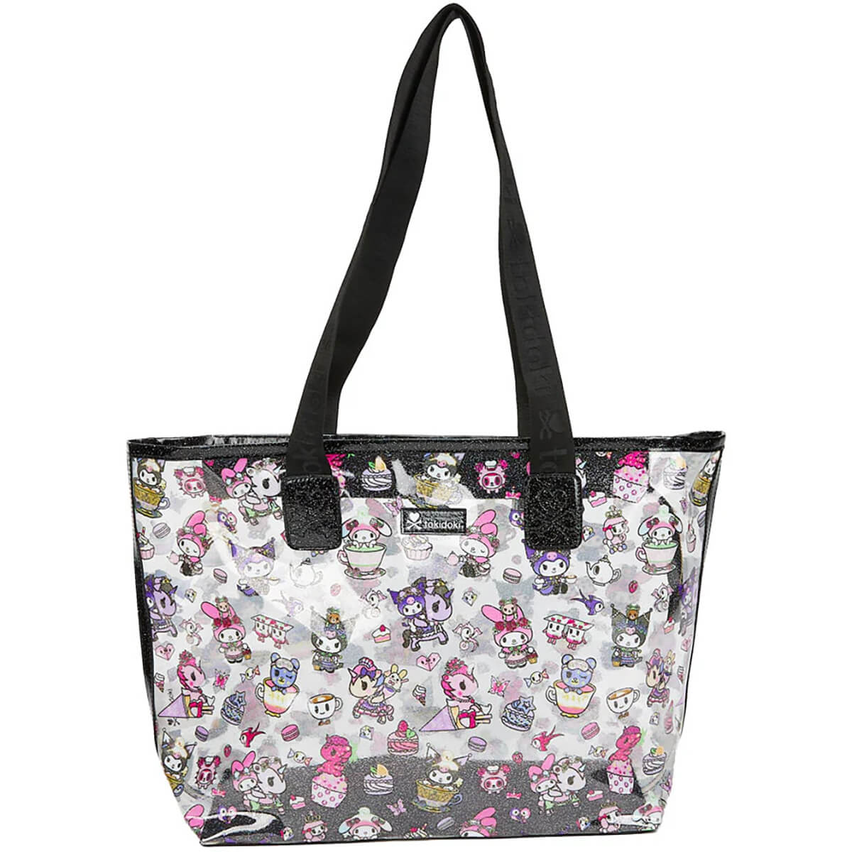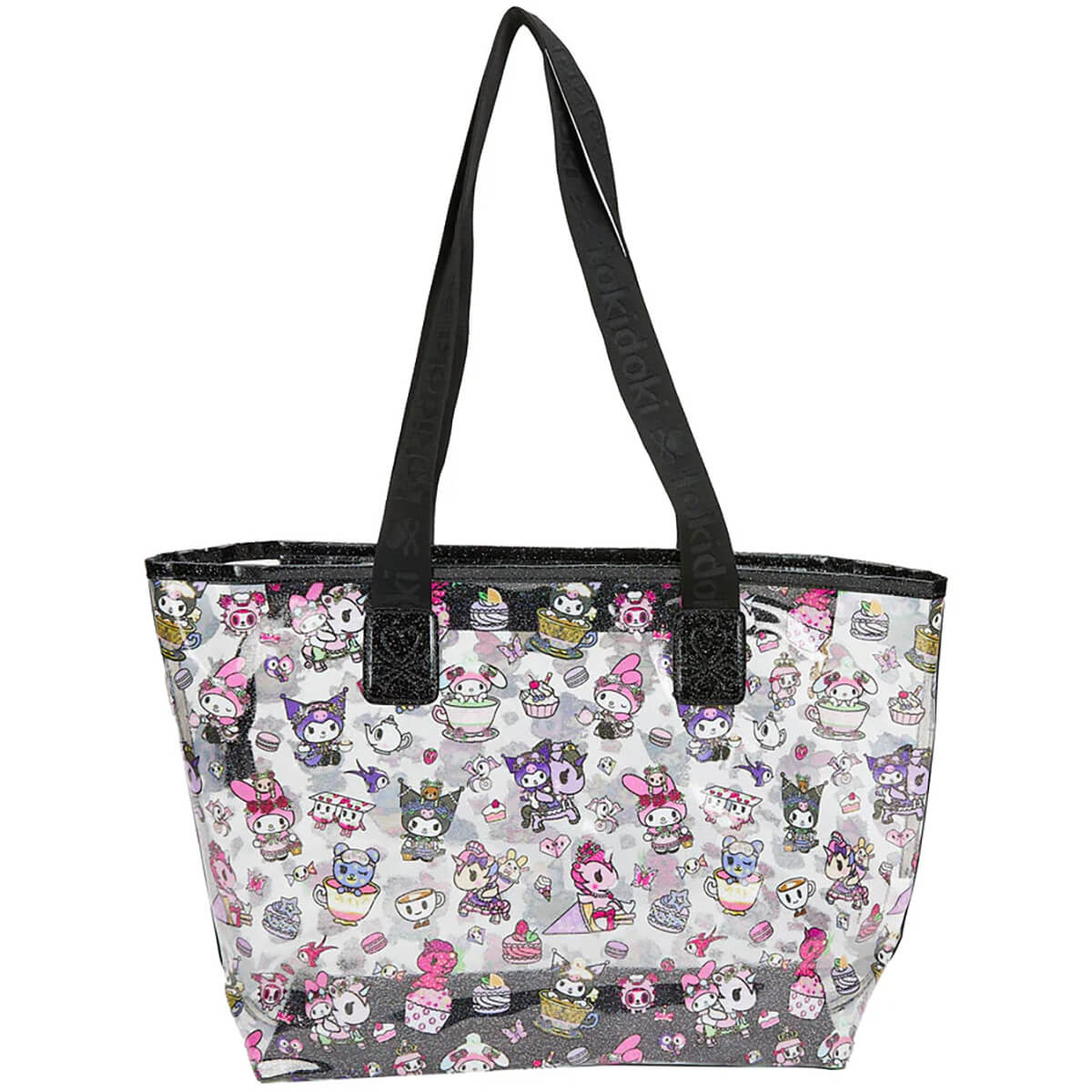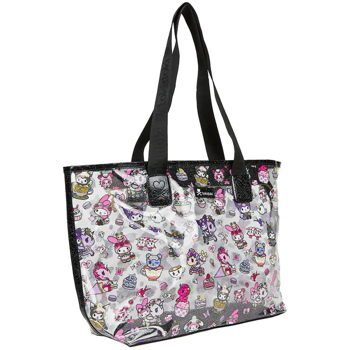 Tokidoki x Kuromi And My Melody Garden Party clear tote bag by Tokidoki. From the Garden Party collection by Tokidoki comes this super cute transparent tote bag with an an all over graphic Kuromi and My Melody print. Features a zippered main compartment with a black trim and a black strap with Tokidoki's signature jacquard-woven logo design. Gold tone hardware, Tokidoki logo zipper pull and logo patch.