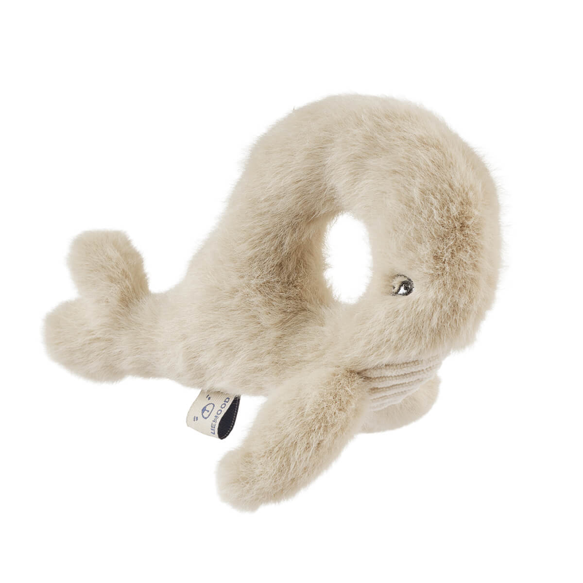 Romain Whale Rattle by Liewood. This whale rattle's soft design makes it the perfect first toy for sensory play. A belle inside the rattle makes a gentle noise. This rattle is suitable for grabbing and grasping and stimulates your baby's senses. Recommended for babies from 2 months, this is the perfect toy for little hands.