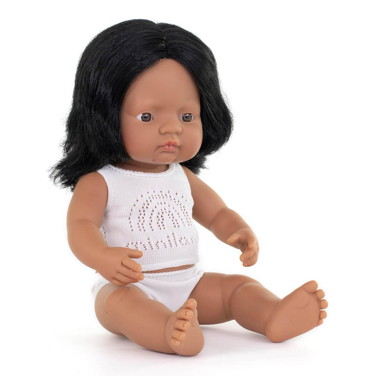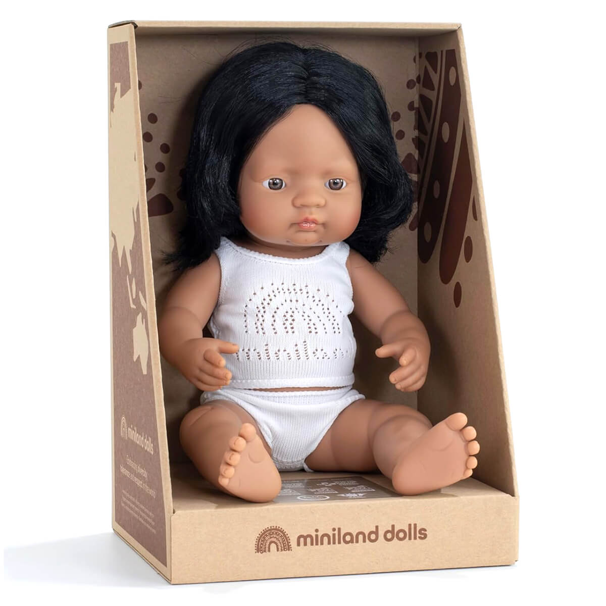 Hispanic girl doll by Miniland. Anatomically correct doll dressed in underwear and lightly vanilla scented to smell like a newborn baby. With moveable limbs and head and sewn on hair, the doll is manufactured from non-toxic Phthalates-free vinyl, which makes it soft and flexible to touch, and very resilient. The doll can also be bathed. Comes in an eco-friendly cardboard box.