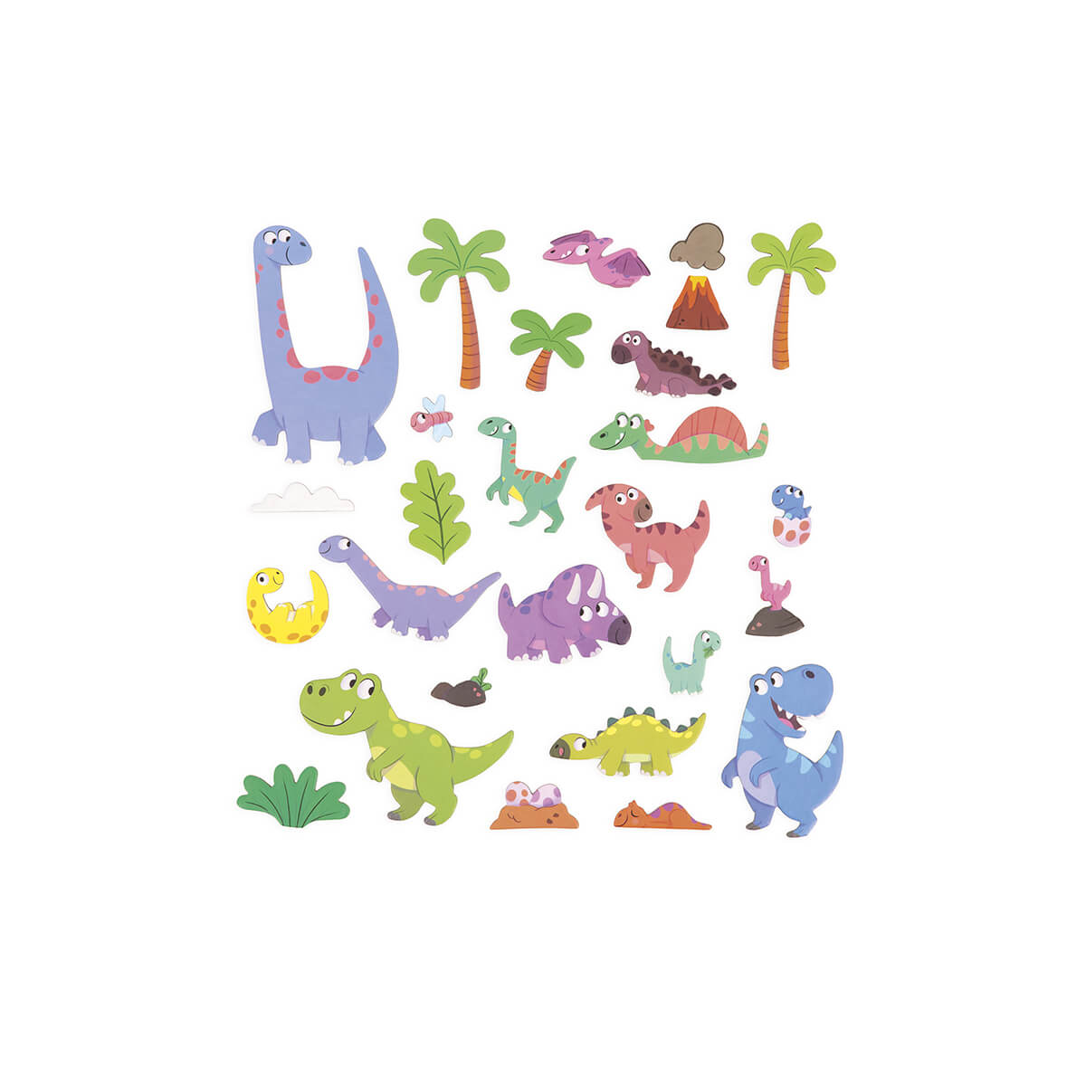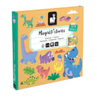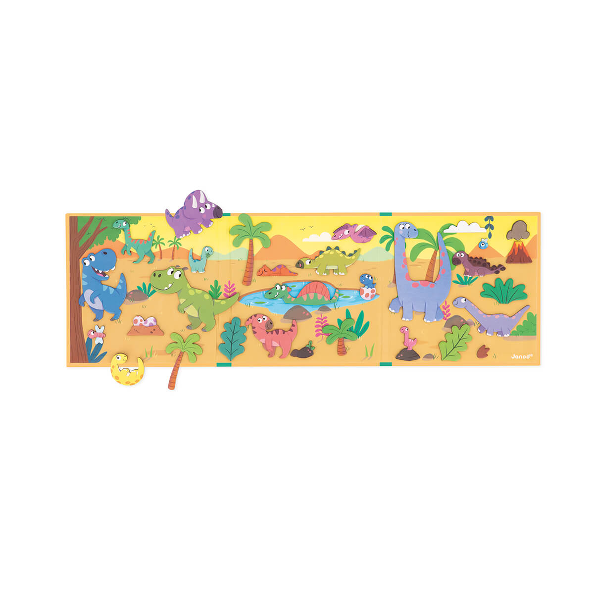 Dinosaur magneti stories by Janod. This magnetic backdrop opens the doors to a distant dinosaur-populated era. With an illustrated backdrop and 30 dinosaur-themed magnets, this game is perfect for on the go imaginative story telling.
