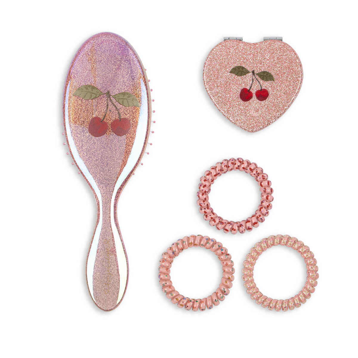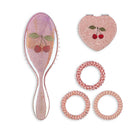 Set contains - a hair brush, hand mirror, 3 elastic hair bands.